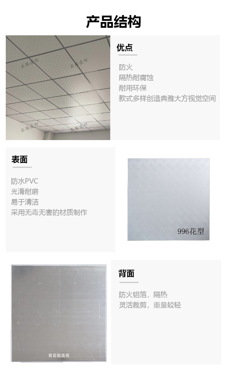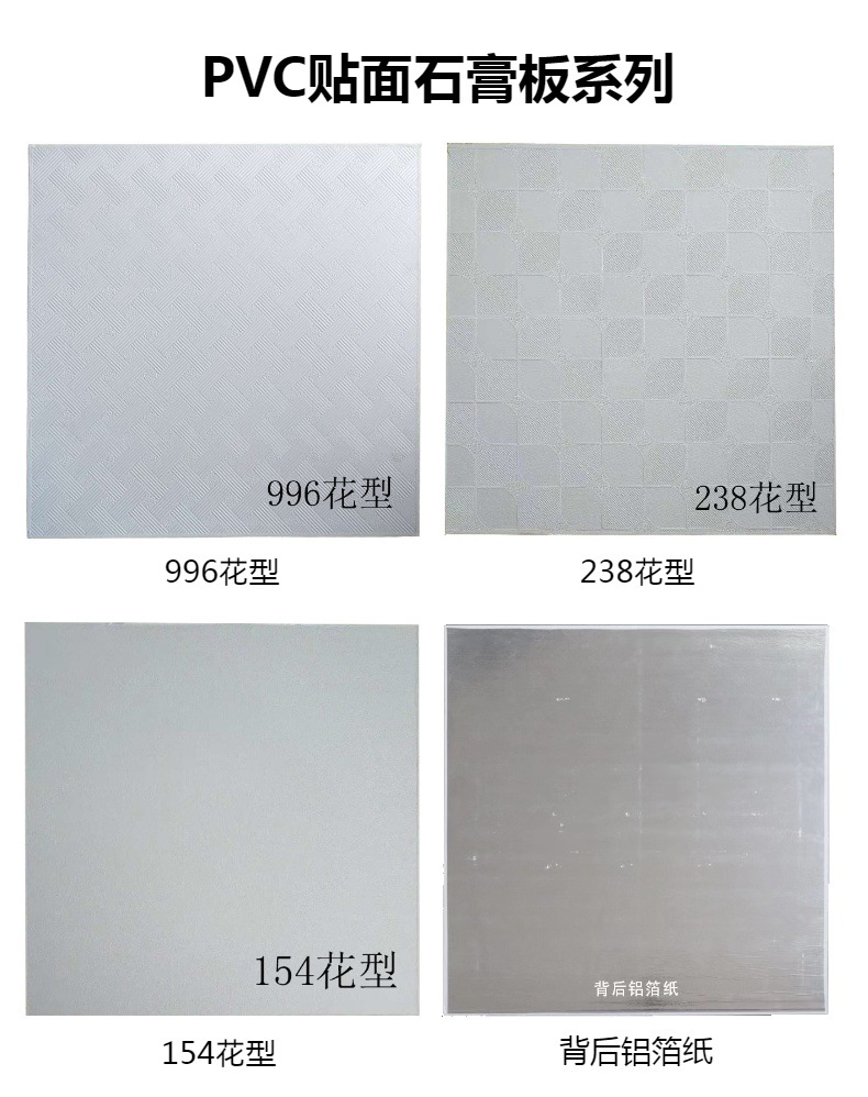 它由优质石膏板制成,表面有PVC层,背面有铝箔