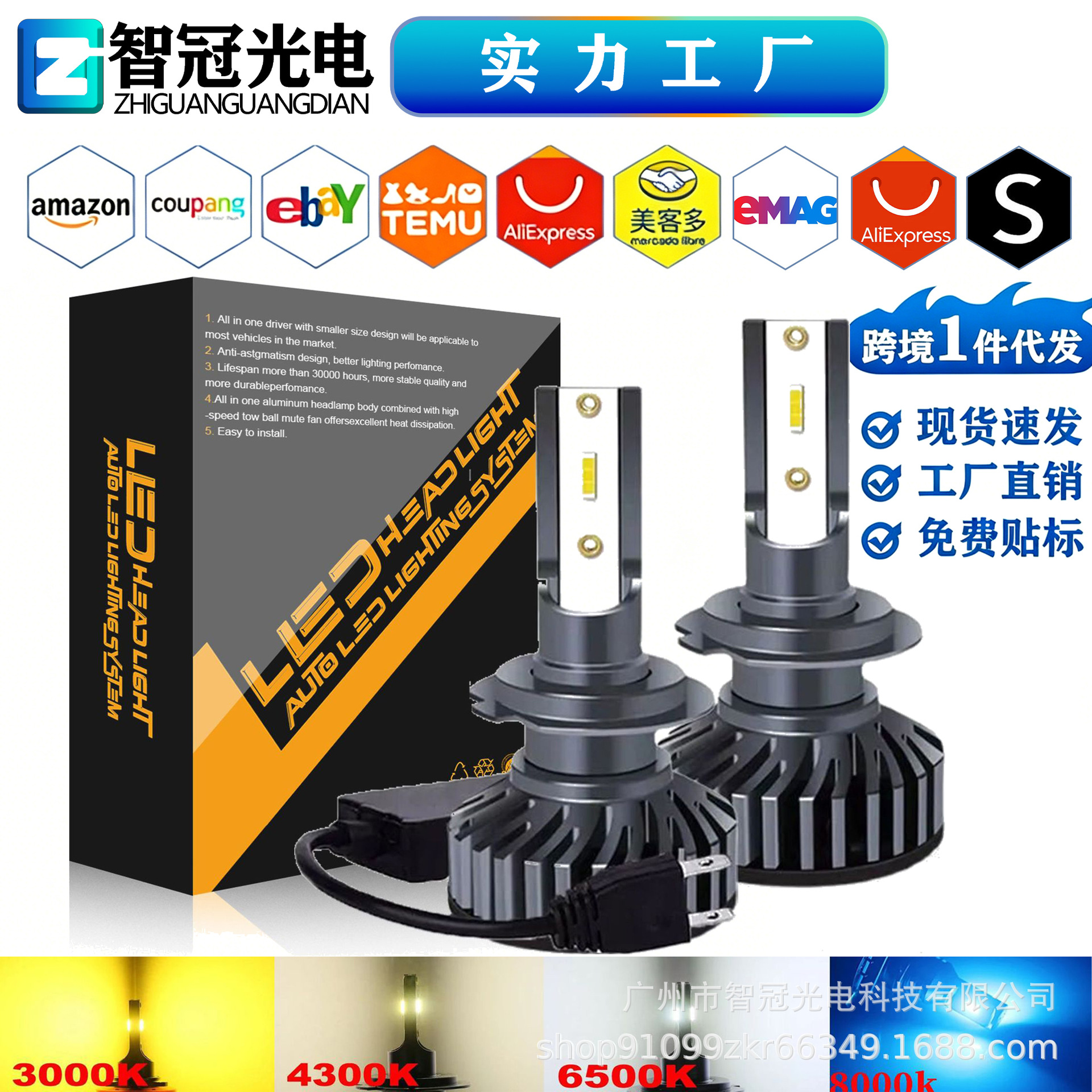 3000K; 4300K; 6000K; 8000K; 25000К ледяной синий