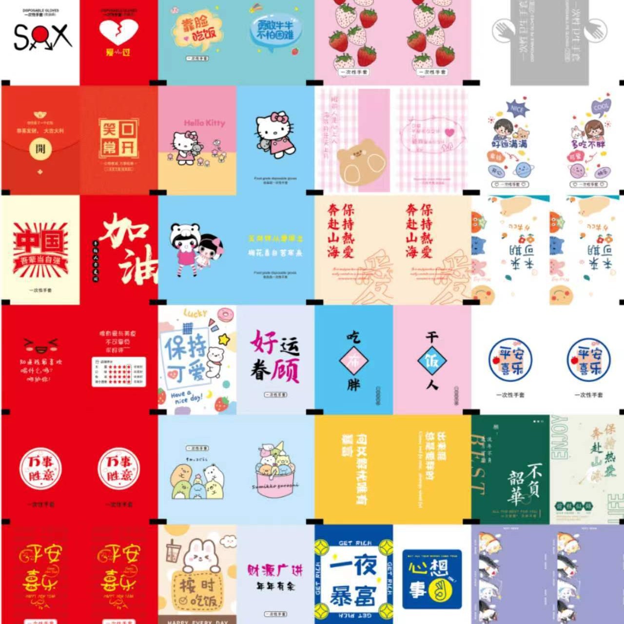Смешивание и сочетание интернет-знаменитостей (рекомендуется); Серия красных конвертов; Национальная тенденционная серия; Будущее многообещающее; Земные слова любви; Сухой рисовый человек; Серия удачи; Серия жареной курицы; Серия для гурманов; Похвальная серия; Лобстер серия; милая утка; Граждански есть; Прямоугольный микс и матч; прямоугольный прозрачный; Крафт-бумага желтого цвета; Крафт-бумага с белым фоном