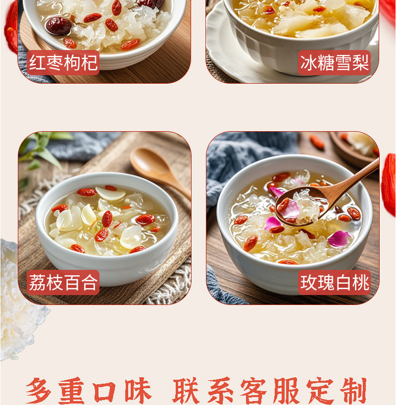 Красный Мармелад Лайчи Серебряные Уха Суп; Суп с розой, белым персиком и грибами Тремелла; Суп с личи, лилией и тремеллой; Ледяной сахар Сидней Серебряный ушной суп