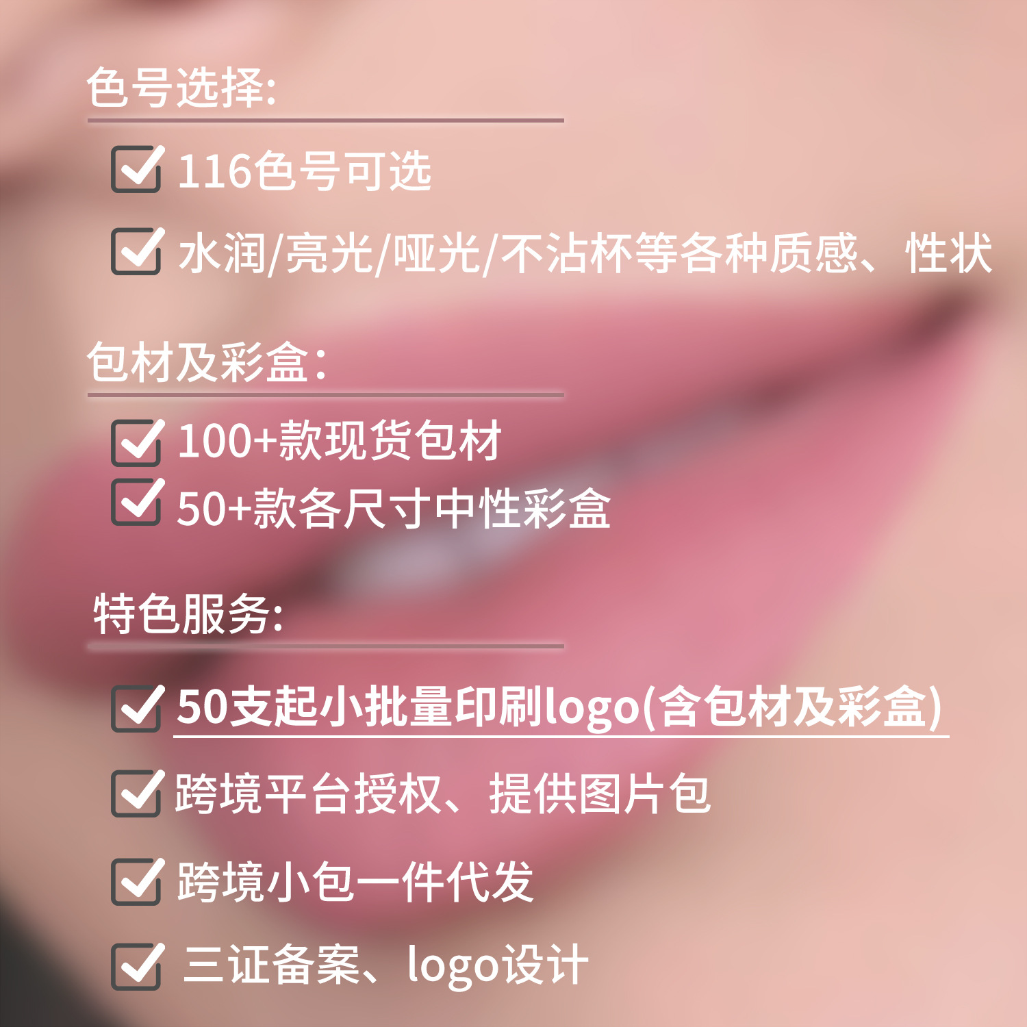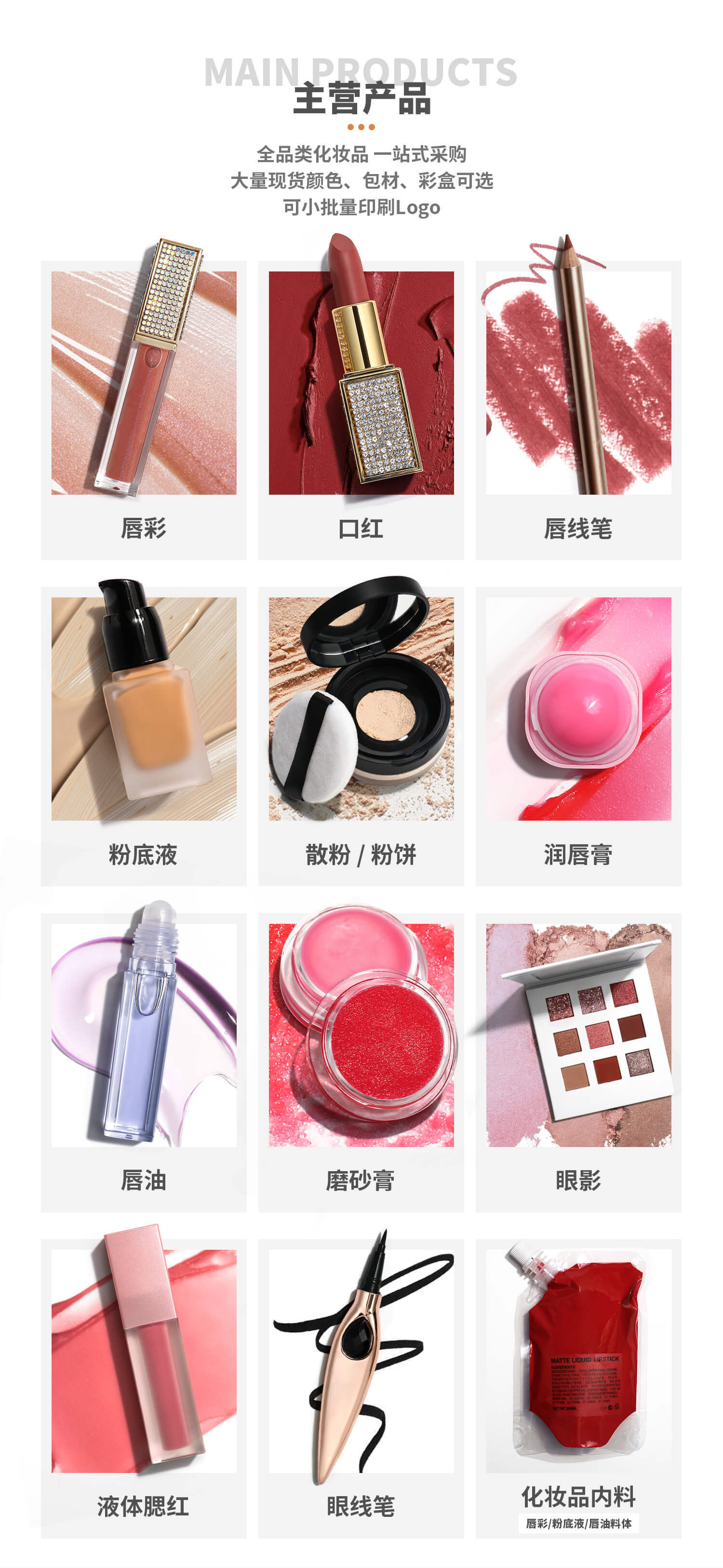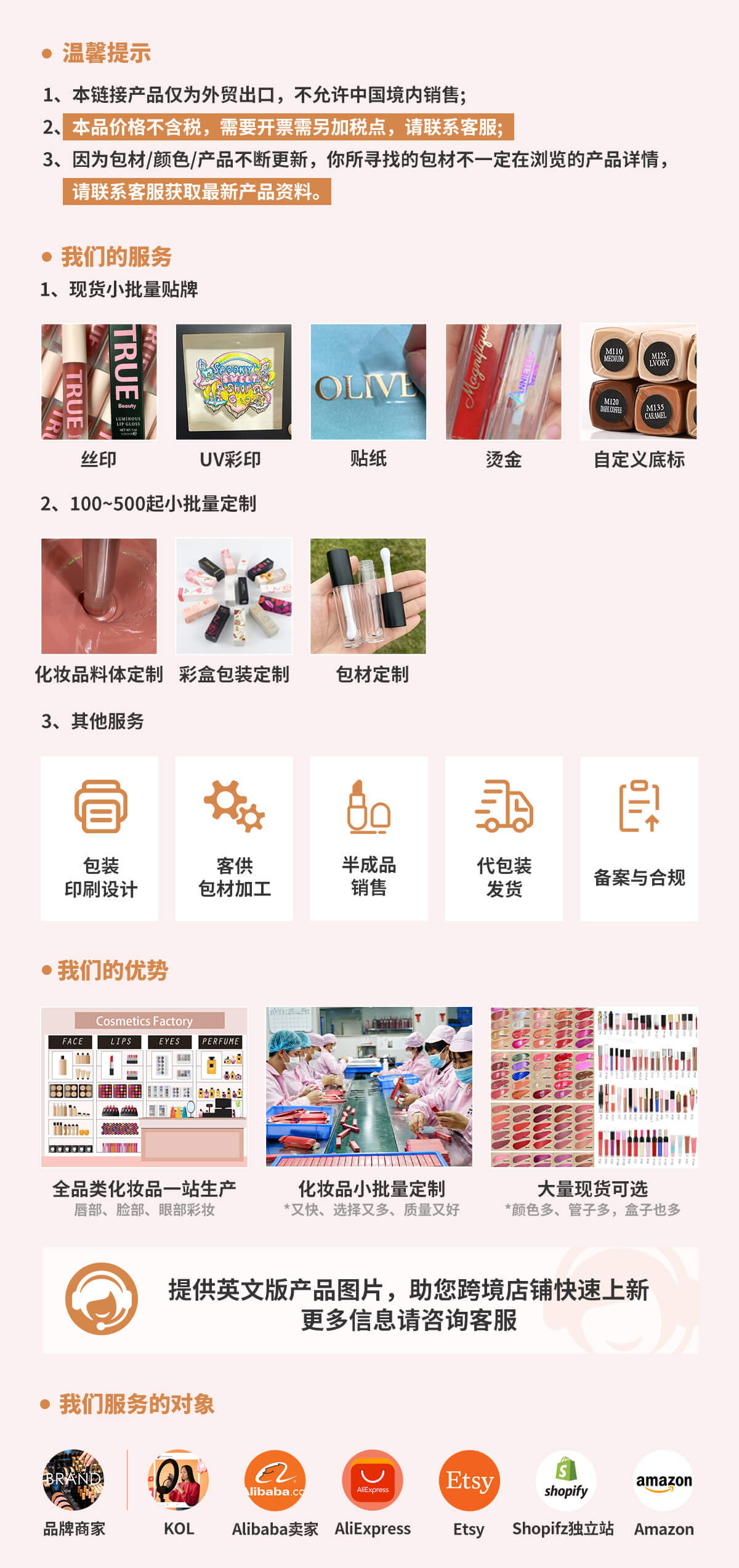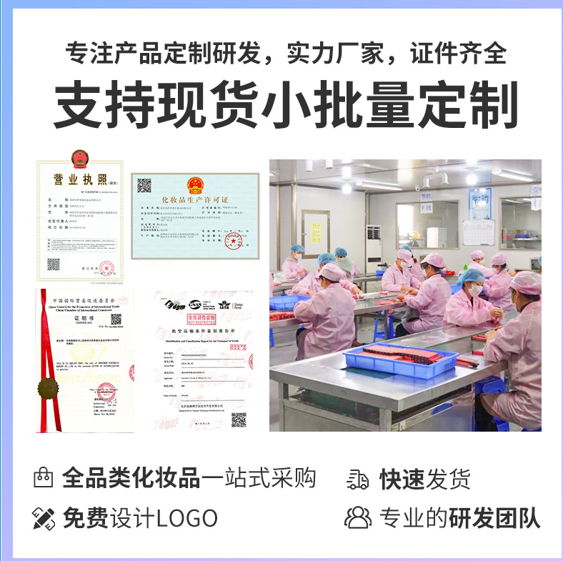 全品类化妆品,50支起小批量定制,支持定制颜色打样,所有产品可换包材灌装不同料体,欢迎向客服索取产品素材包,价格表;