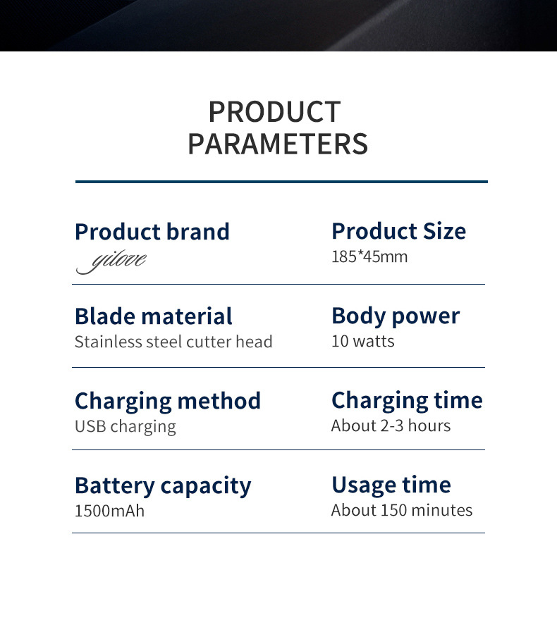 产品配件:包装盒、说明书、4个限位梳、1根USB充电线、1瓶润滑油、1个清洁刷