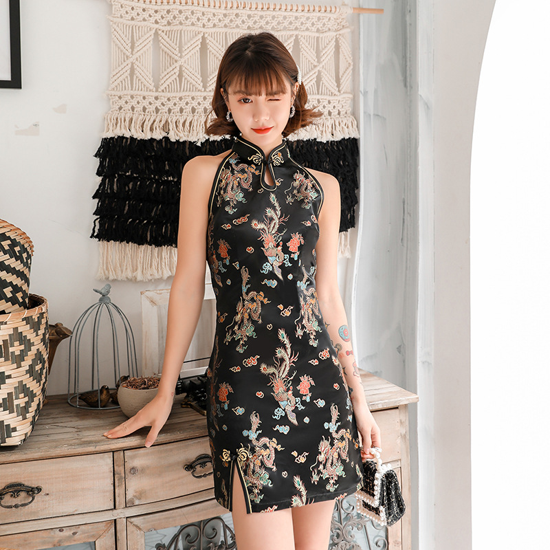 Новинка Весна 2025: Улучшенное платье-ципао с воротником-стойкой, без рукавов, с разрезом, принтованное, облегающее, сексуальное, для женщин, оптом