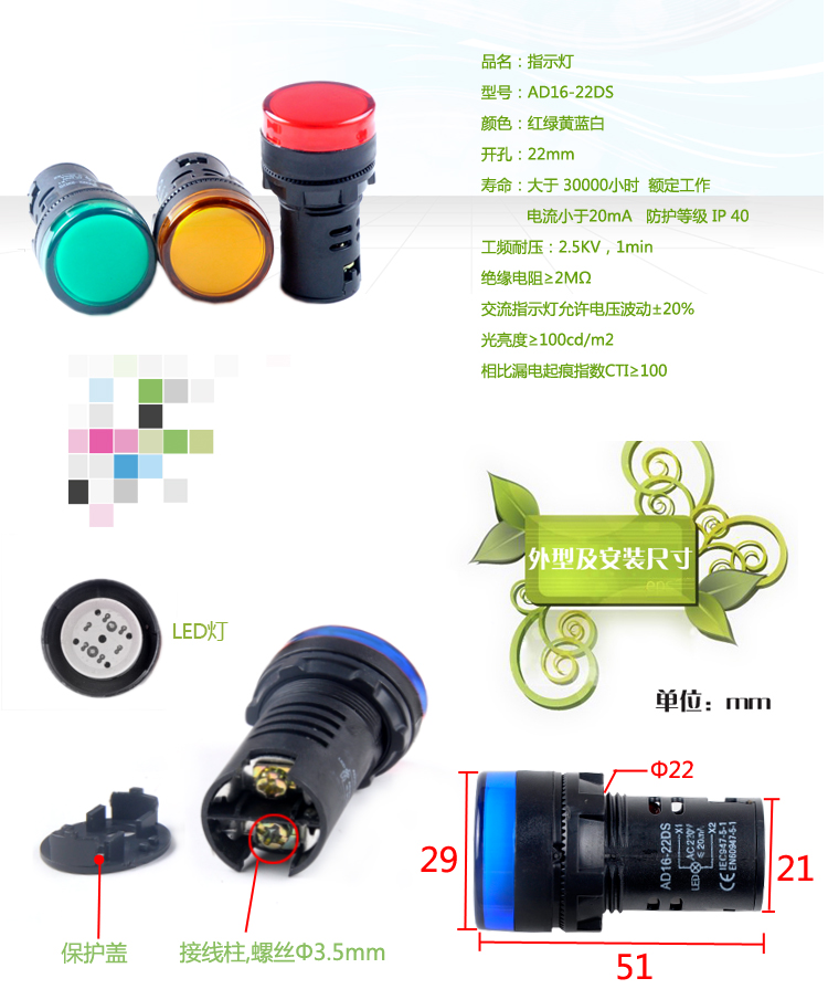 产品用途:适用于电力、电讯、机床、船舶、纺织、、矿山机械等设备的线路中作指示信号、预告信号、事故信号及其他指示用信号。