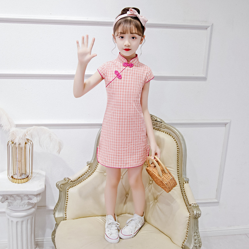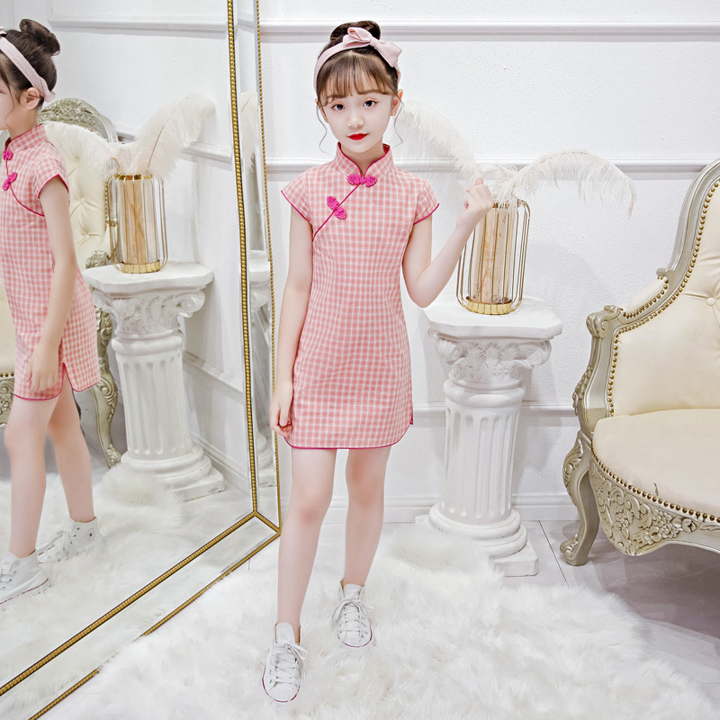 Короткое платье-Чонсам для девочек 2023, летнее улучшенное платье-чонсам, клетчатый Детский костюм Тан в китайском стиле в стиле ретро