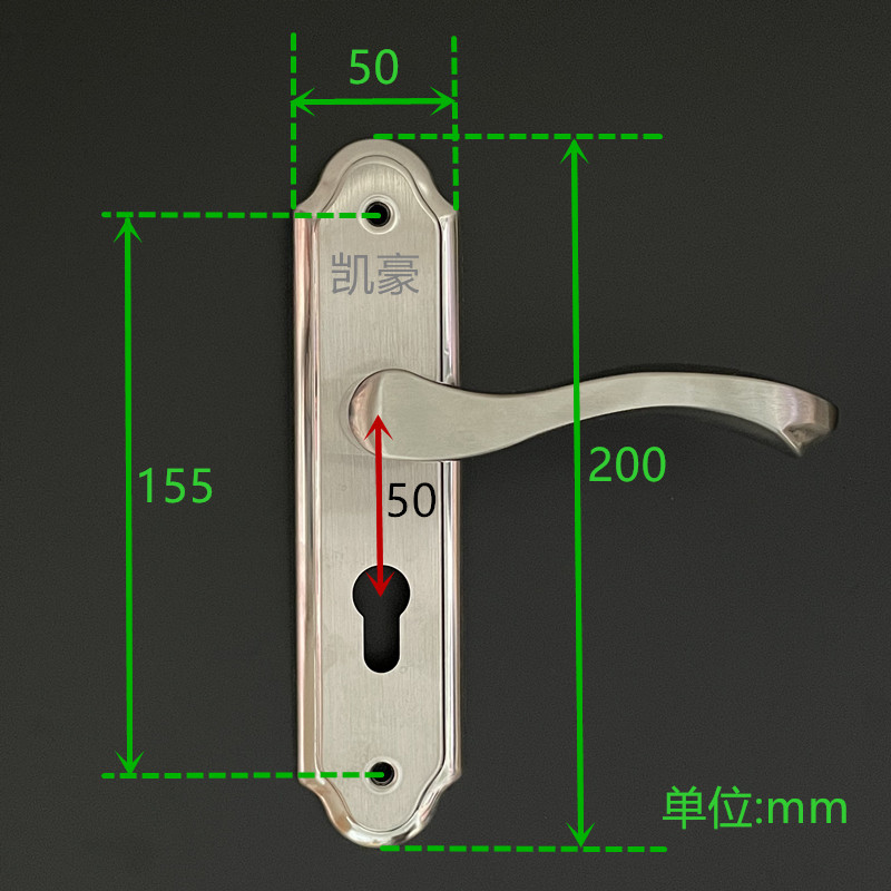 此款不锈钢机械门锁,面板长200mm,宽50mm,厚度0.7MM左右,螺丝孔距155mm,表面水磨处理。