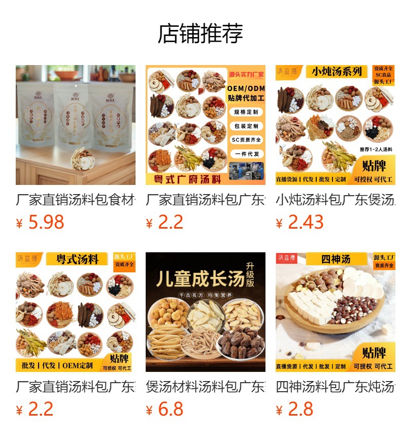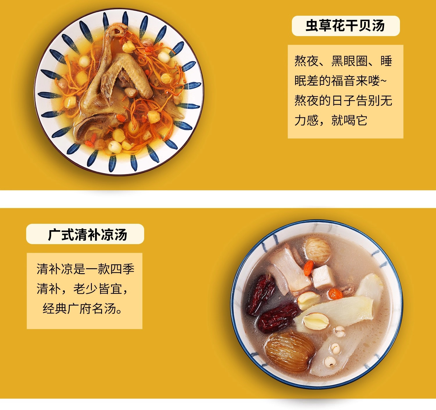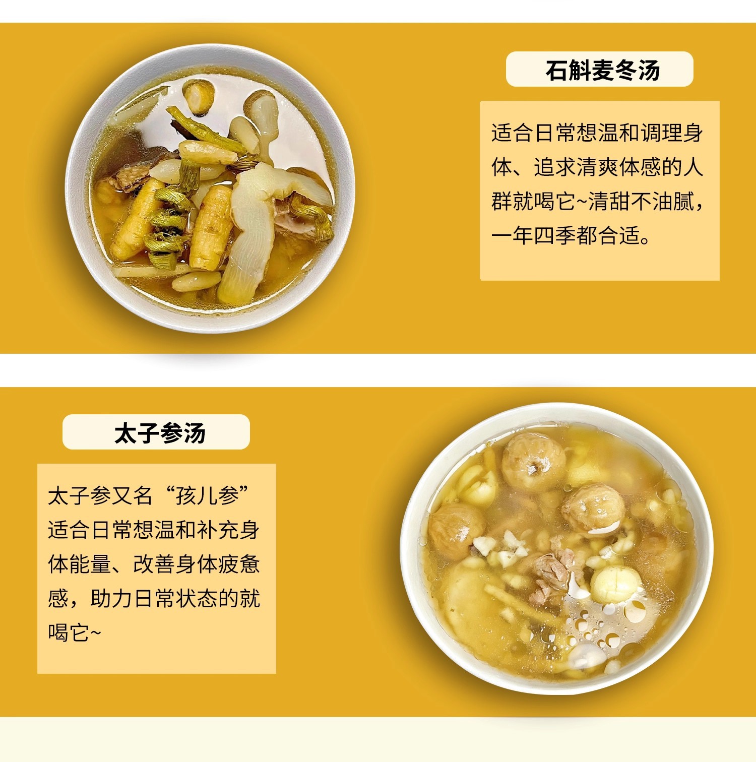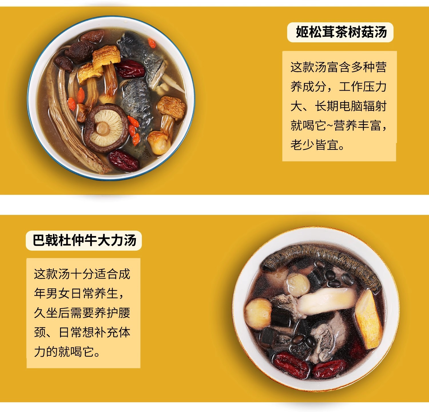 Освежающий и питательный суп 75г.; Детский суп «Четыре Бога» 22 г (пить без еды); Суп из цыплячьей скорлупы, солодового и боярышника 125г (25гХ5 упаковок); Суп с женьшенем и кордицепсом, 22 г; Суп «Лилия и Груша» 70 г (напиток для осени); Суп «Пятипалый персик и пория» 115 г (тушеный куриной суп); Новый суп Сишень 98г; Новый суп из четырех трав, 98 г (заменяет прием пищи); Новый суп «Лилия и Груша» 70 г (осенний увлажняющий напиток); Новый суп «Пять пальцев» с персиком и порией кокосовой, 115 г (основа для тушеного куриного супа); Суп миндаль и полигонатум 71г; Суп из шелковицы и лилии, 75 г (напиток для послеобеденного времени); Суп американский женьшень и волчья ягода 50г; Суп миндальный с грибами «Тигровое молоко» 115г (мясные ребрышки свинины тушеные); Суп из гребешков и бамбука 66 г (Тушёные куриные ребрышки); Пшеничный бутон боярышник пятизвездный суп 70г; Суп из цветков кордицепса и лонгана 70 г (тушеная курица и голубь); Суп из абалона и грибов 68 г (питательный); Суп с женьшенем и кордицепсом 60 г (Ингредиенты: тушеный голубь и ягненок); Суп из пуэрарии лобата и пории кокосовой 105 г (тушеная утка); Суп из амомума и ямса 75 г (тушеное свиное сердце); Пакетик для супа с грибами чайного дерева 62 г (пуховый суп с уткой для горячего котла); Суп из орехов полигонатума 75 г (тушёный свиный хвост); Суп из корня Мао, бамбуковой трости и снежной груши 120г; Суп из желудей и желудей 63г; Суп из гастродии и полигонатума, 58 г (тушеная рыба с головой и голубь); Суп из полигонатума и лонгана 68 г (кантонский бараний суп); Суп из дендробиума и снежной груши, 60 г (увлажняющий); Суп из грибов Агарикус Блази и лонган, 63 г; Суп из кодонопсиса и астрагала 55 г (тушеный бараний суп); kordyceps Цветочный суп 65г; Желатин из ослиной кожи и суп из рыбьей пасти 56 г (после менструации); Суп Ганодерма луцидум и пория кокос 83г; 80 г супа астрагала с коровьим мясом Дали (тушеная кость дракона); Суп герациум и инжир 78г; Суп из полигонатума, снежной груши и тремеллы, 130 г (26 г x 5 упаковок); Суп из ежевики 125 г (25 г x 5 упаковок); Напиток из боярышника с одним ингредиентом, 65 г (для улучшения пищеварения); Очищающий суп для сердца с оphiopogon japonicus, 55 г; Суп-пакет с грибами 110 г (22 г x 5 пакетов); Суп с агариком бразильским и ягодами лисьего варежки, 110 г (5 упаковок по 22 г); Пятипалый суп из персика и пории, 27 г, 5 пакетов; Суп из дендробиума и груш 125 г (25 г x 5 пакетов); Ниу Дали персиковый пятипалый 150 г (упаковка 30 г x 5); Суп Гастродия, Полигонатум, Ганодерма, упаковка 17 г x 5; Суп с цветками кордицепса и морским гребешком, 100 г (5 упаковок по 20 г); Суп из морских ежей Morel, 100 г (20 г x 5 упаковок); Суп из мушель и мошек 125 г (25 г x 5 упаковок); Суп с дендробиумом и ганодермой, 100 г (5 упаковок по 20 г); Цистанческая пустынная и говядина 110г (22гх5 упаковок); Суп из американского женьшеня, офипогона и цедры мандарина, 22 г x 5 упаковок; Суп с цветками женьшеня и кордицепса, 110 г (22 г x 5 упаковок) (с ингредиентами из тушеного голубя и баранины); Суп с рейши и порией, 150 г (5 упаковок по 30 г); Суп из семян лотоса Bawang, 125 г (25 г x 5 упаковок); Суп из рыбьей пасти и цветков кордицепса, 100 г (5 упаковок по 20 г); Суп из черных бобов Niu Dali, 28 г, упаковка из 5 штук; Сок из бамбукового сахарного тростника Mao Gen, 175 г (35 г x 5 упаковок); Пуэрария обыкновенная 75 г (15 г x 5 упаковок); Плоское качество, упаковка из 5 штук; Сумка Temperament x5; качество ян; Качество Yin, упаковка из 5 штук; Мокрота, упаковка из 5 штук; Влажные салфетки, упаковка из 5 