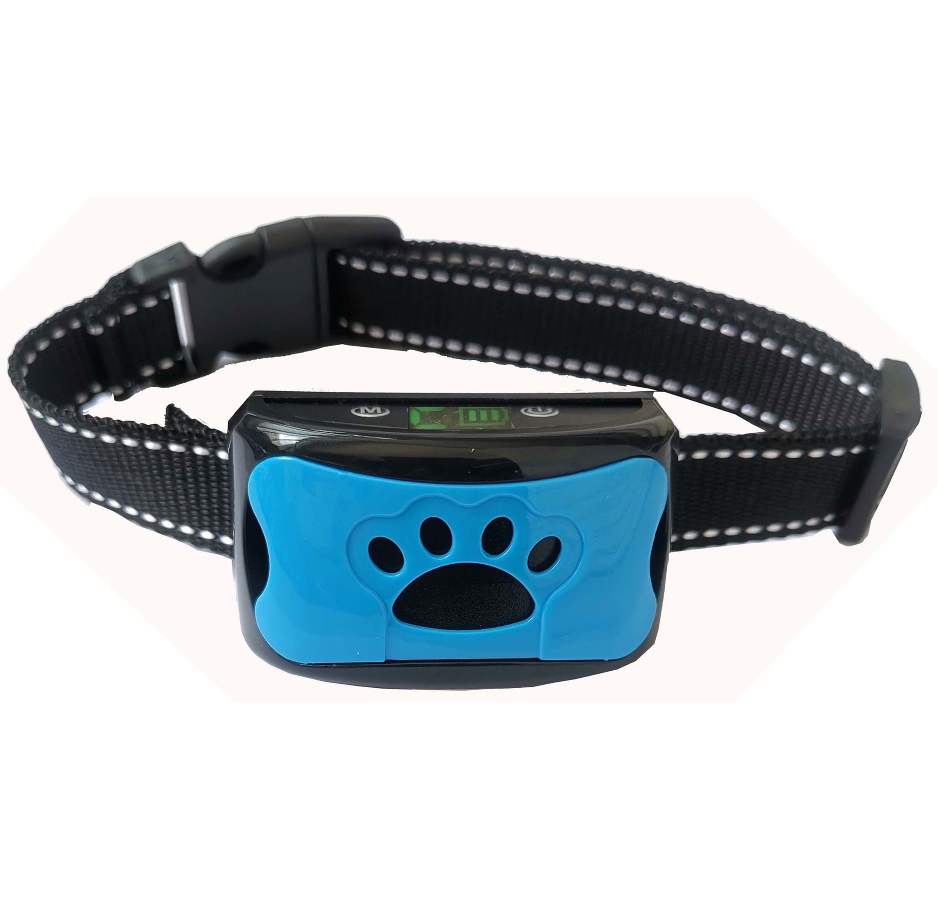 产品主要功能:功能符号及辨别非常清晰,使用更方便 以选择产品震动功能原理, 第一次触发犬叫声.预警声音发出,工作指灯亮自动亮, 震动最弱输出,狗狗会有所反应,产品自动复位开始模式,若狗狗无反应,进去下一功能模式。 第二次触发犬叫声.预警声音发出,.指灯亮自动亮灯,震动输出,狗狗有所反应,产品自动锁定第二次模式,若狗狗无反应,进去下一功能模式。 第三次触发犬叫声.预警声音发出.指灯亮自动亮灯,震动强度输出,狗狗有所反应,产品自动自动锁定第三次模式,若狗狗无反应,进去下一功能模式。 第四次触发犬叫声,.预警声音发出,.指灯亮自动亮灯,震动中强输出,狗狗有所反应,产品自动自动锁定第四次模式,若狗狗无反应,进去下一功能模式。 第五次触发犬叫声,.预警声音发出,.指灯亮自动亮灯,震动稍强输出,产品自动锁定第五次模式,若狗狗无反应,进去下一功能模式。 第六次触发犬叫声. .预警声音发出,指灯亮自动亮灯,震动最强输出,产品自动锁定第六次模式,若狗狗无反应,进去下一功能模式。 第七次触发犬叫声,.预警声音发出.指灯亮自动亮灯,震动超强度输出,狗狗有所反应,产品自动自动锁定第七次模式, 电击输出模式跟震动输出7次模式一样,第一次最弱,第7次最强。 若狗狗还是无反应,产品自动停止工作。1分钟后自动重启工作模式,也可以按开关按钮重启. 本产品在一分钟内连续触发工作7次以上,会自动停止保护工作,防止刚开始不适应宠物,也防止伤害狗狗。
