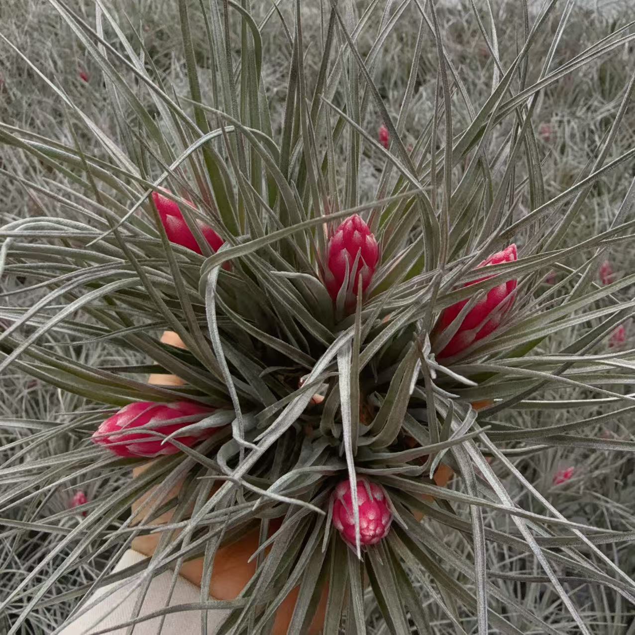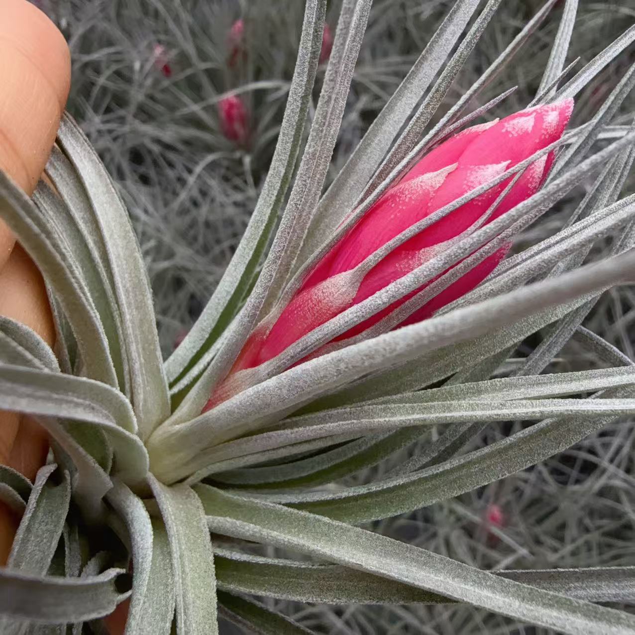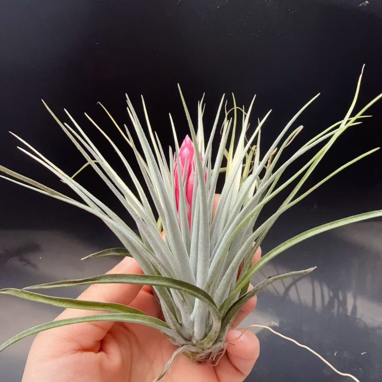 又名修士顿,音译,与棉花糖非常相似,是空气凤梨中少数的美花品种之一,株型舒展,花期呈枚红色花箭,层层开出粉红色花朵,很有观赏性,普货中相当受欢迎的品种。