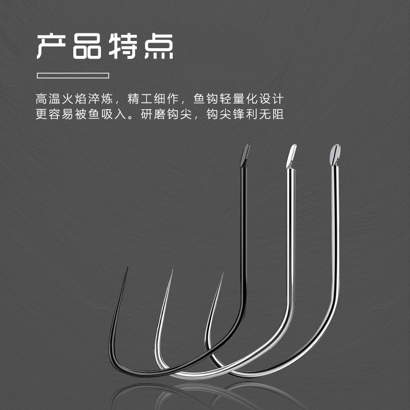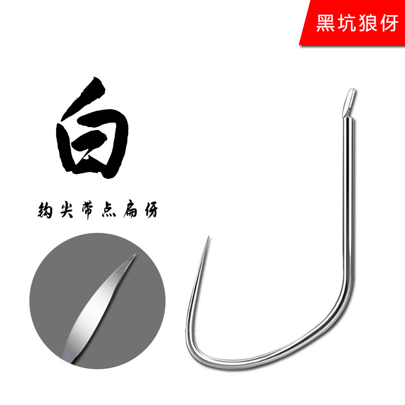 袖:此钩型无倒刺。钩尖锋利,钩柄长,钩条细钩身轻,适用于吸入取食的小型鱼种,快钓快取,多用于钓白鲫、小白条等。