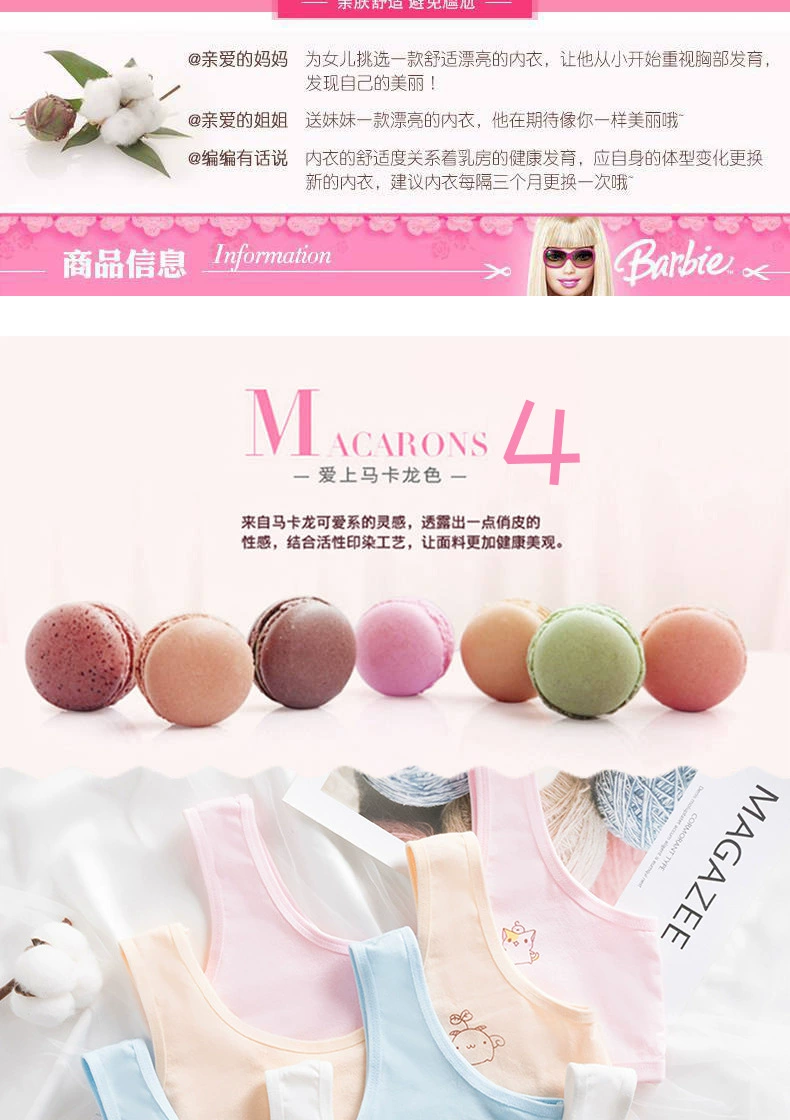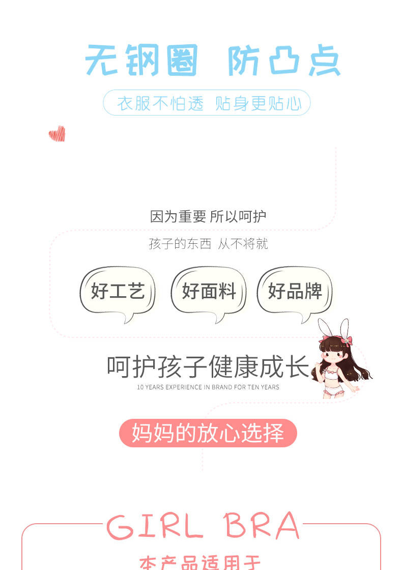 本厂专营中高档发育期内衣,库存充足,自产自销,价格优势,一手出厂货源,纯棉面料,安全健康,拒绝使用低劣面料,环保印染工艺,不起球不掉色,给孩子带来一件安全健康的内衣。此款适合8-16岁发育期阶段女童,儿童少女穿着更舒适。量大请直接联系客服有优惠,收藏店铺优先发货