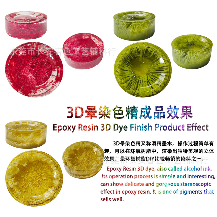 第三代晕染色精又叫酒精墨水,由白色和其它彩色混合在环氧树脂中生成美丽的波纹和炫丽的3D效果。是当下DIY非常流行的工艺原料。操作时先滴下带颜色的染料,再滴白色。注意用量,不同的用量会出现不同的效果。