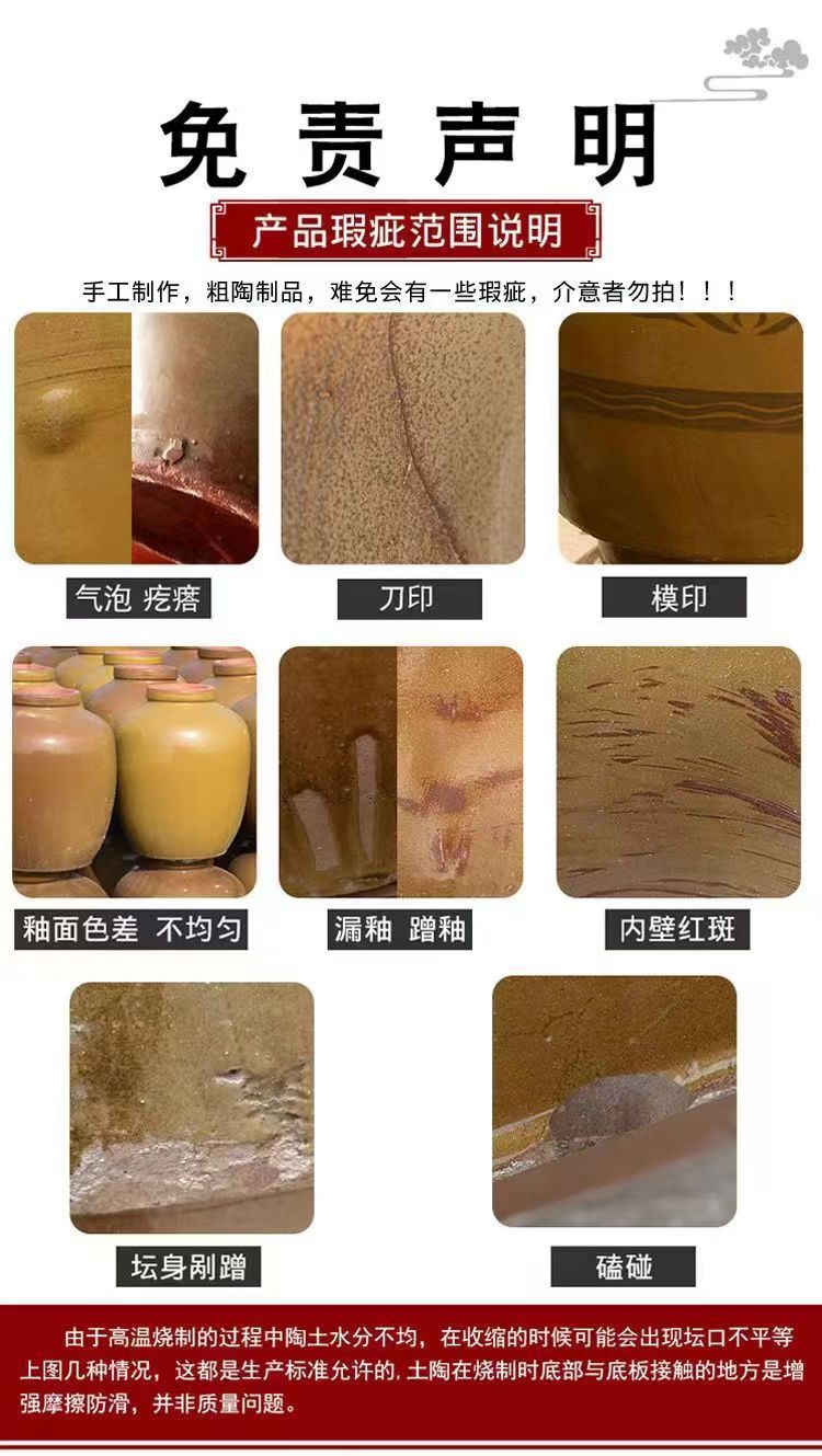土陶产品原色无添加,批次不一样,会有一些颜色差异,敬请知晓,如遇有疑问,请联系我们在线客服详细询问,我们竭诚为您服务。质量按国内企业标准:陶坛以不漏水、无破烂为标准。如有纠纷友好协商,若有违约,违约方按合同法承担违约责任,管辖权归隆昌市人民法院。