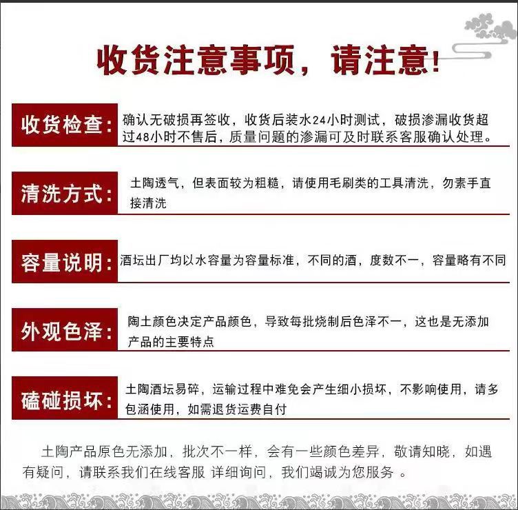 磕碰损坏: 土陶酒坛易碎,运输过程中难免会产生细小损坏,不影响使用,请多包涵使用,如需退货运费自付