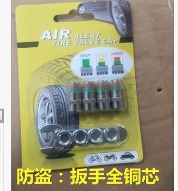 胎压帽是一种针对测量轮胎气压辅助工具,将胎压帽锁固于轮胎气咀之上,直接目视透明盖内的颜色变化来判断轮胎压力是否充足,省去用仪器的烦琐!