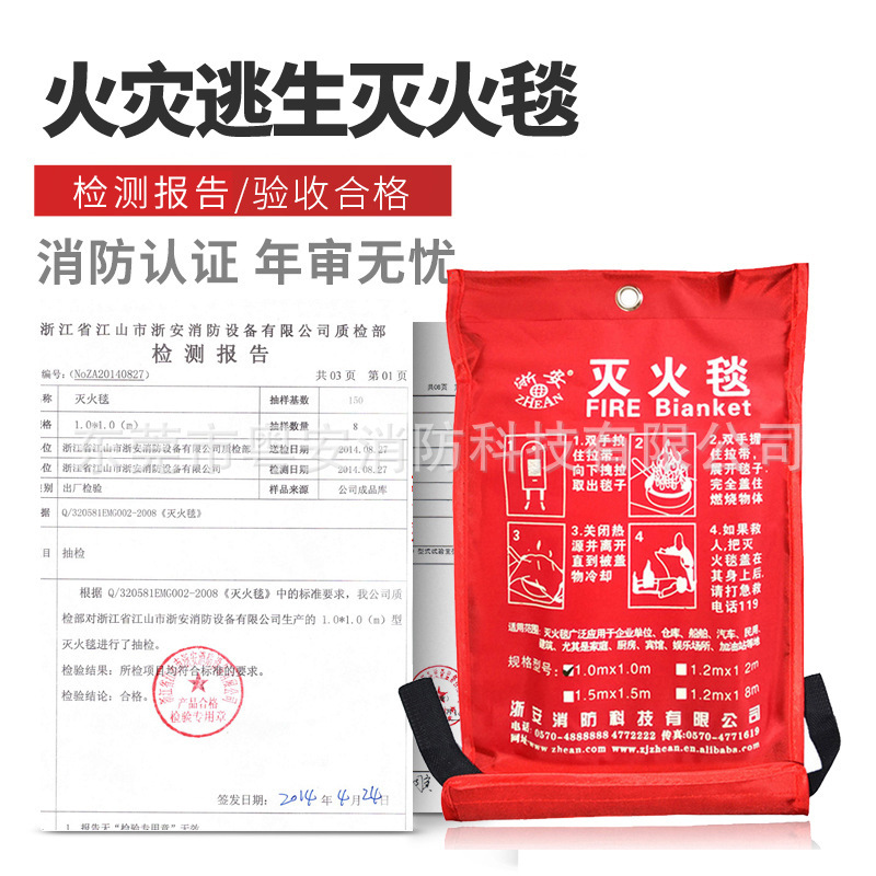 四、国家暂无灭火毯产品的3C标准,浙安牌有1.5m*1.5m检验报告,如需可联系客服。