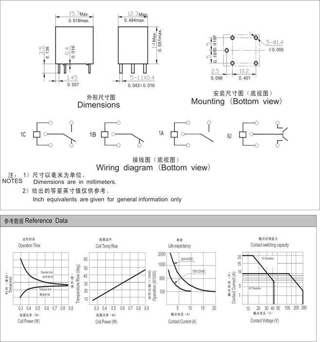 触点形式 Contact Arrangement | 1A(1H)(SPST NO);1B(SPST NC);1C(1Z)(SPDT);1U | ||||||||