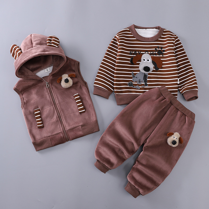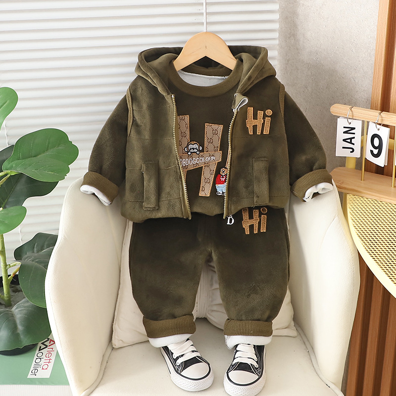 秋冬爆款采用双面绒加绒材质。尺码80-110.适合0-4岁宝宝穿。舒适温暖!三件套背心加长袖内搭,加裤子!深色会有轻微浮色,完美主义者慎拍