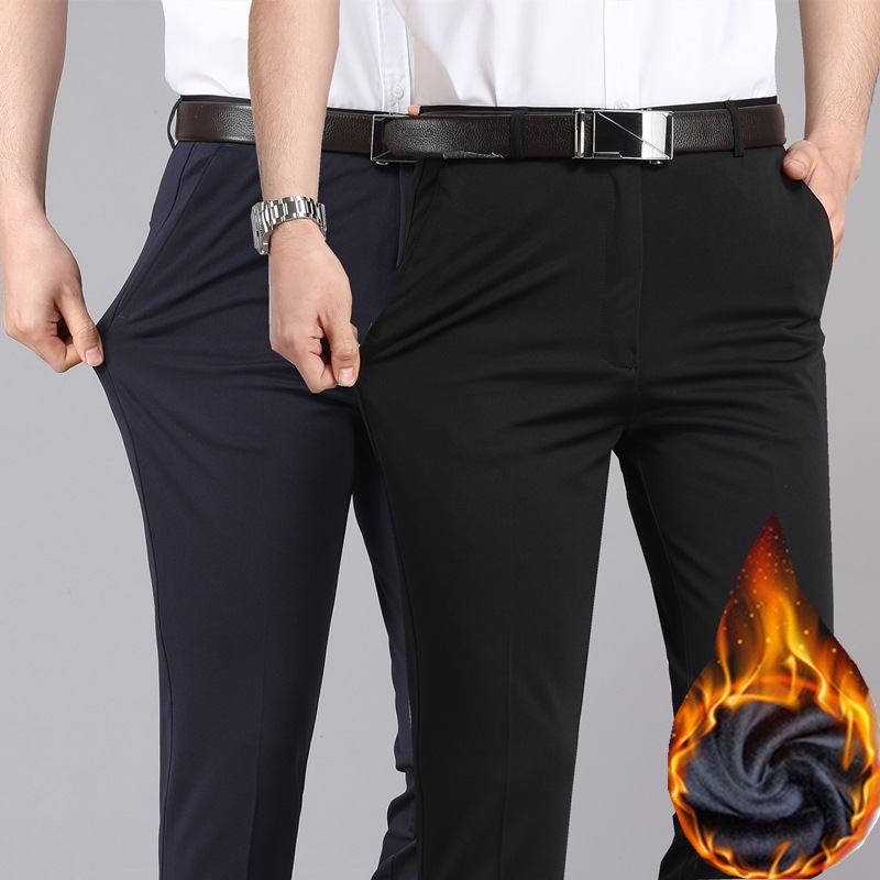 Мужские брюки для делового костюма, повседневные классические брюки, эластичные формальные мужские брюки, осенне-зимние толстые свободные прямые брюки на флисовой подкладке для мужчин