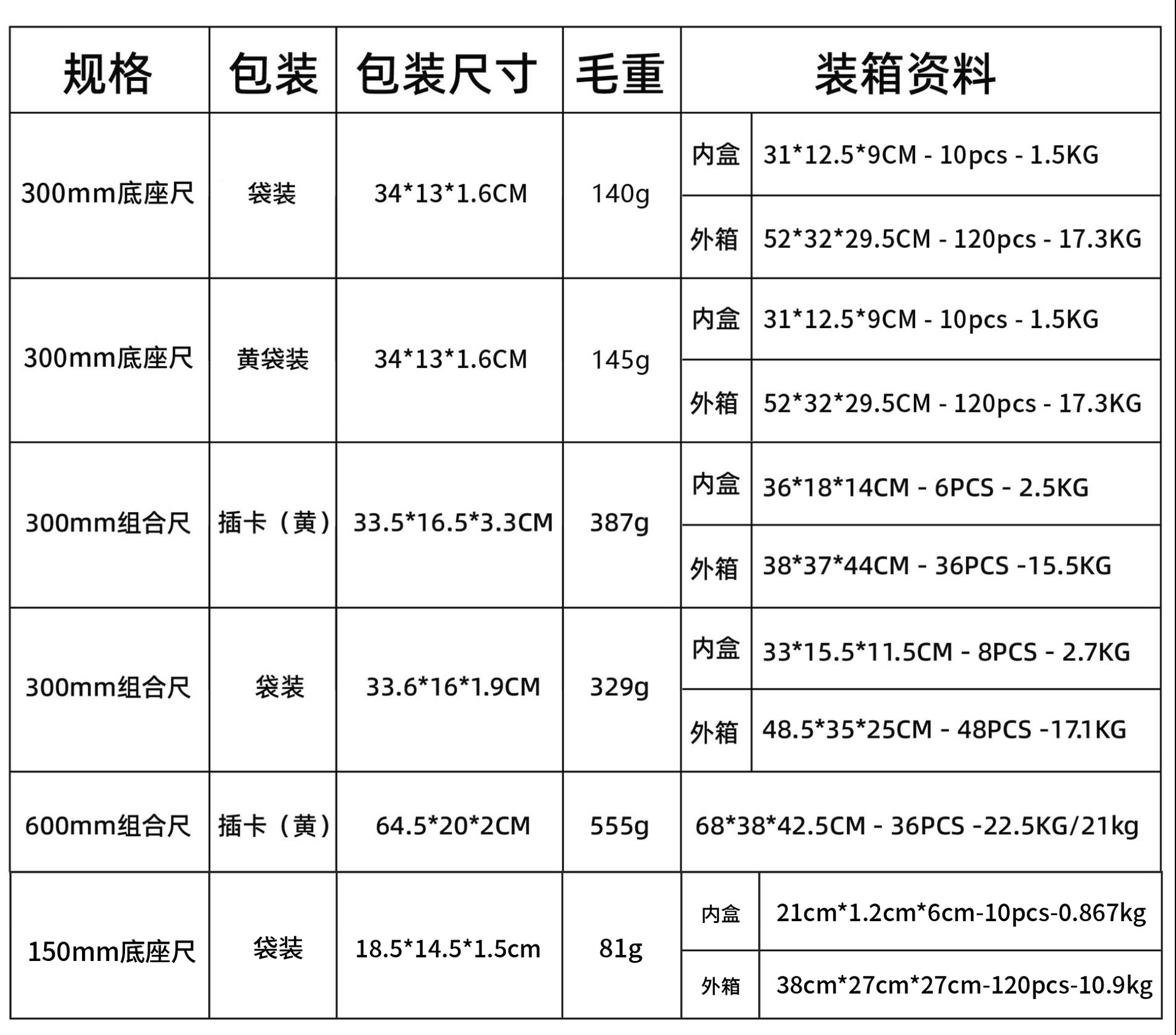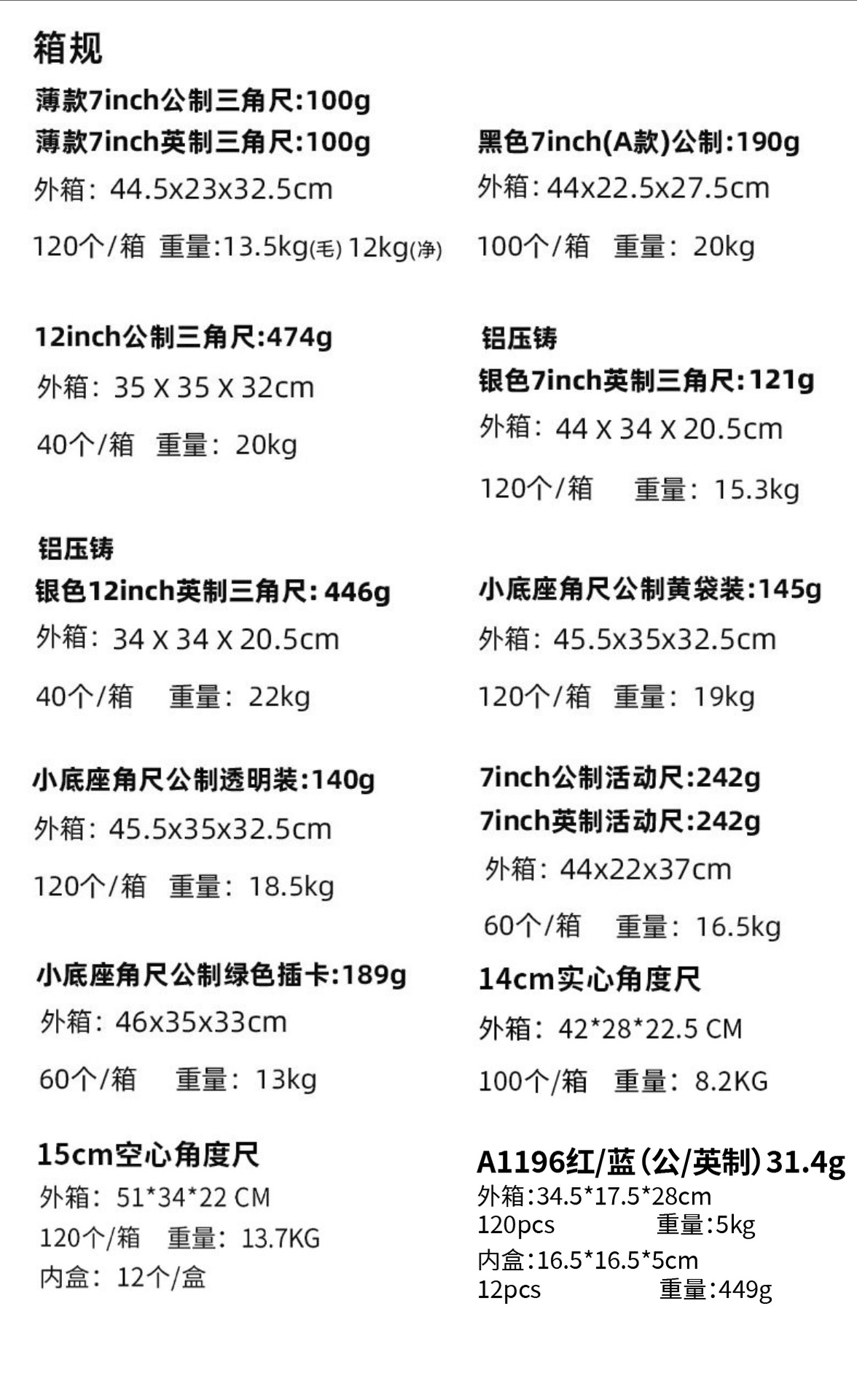 Линейка в сетку в прозрачном пакете 78г.; Линейка основания 150 мм в прозрачном пакете 81 г; Линейка базовая (метрическая с обеих сторон) 140г в прозрачном пакете.; Линейка базовая (метрическая с обеих сторон) желтая пакетик 145г; Базовая линейка (метрическая с обеих сторон), упаковка зеленая карточка 185,5 г.; A1271-300 мм комбинированная квадратная желтая сменная карта 387 г; A1272-300мм комбинированный квадратный пакет 329г; A1196 Красный метрический [мешок] 31,4 г; A1197 Синий метрический [сумка] 31,4 г; A1198 Red Imperial [Сумка] 31,4 г; A1199 Blue Imperial [Сумка] 31,4 г; Черный свет 12 дюймов метрический [сумка] 422 г; Красный свет 12 дюймов метрический [сумка] 422 г; Синий свет 12 дюймов метрический [сумка] 422 г; Серебряный 7-дюймовый Императорский [Сумка] 125 г; Серебро 7 дюймов Метрическая [Сумка] 119 г; Черный тонкий 7 дюймов [сумка] 100 г; Черный тонкий 7-дюймовый метрический [мешок] 100 г; Красный тонкий 7-дюймовый имперский [мешок] 100 г; Красный тонкий 7-дюймовый метрический [мешок] 100 г; Синий тонкий 7 дюймов [сумка] 103,5 г; Синий тонкий 7-дюймовый метрический [сумка] 103,5 г; A1189-14см линейка твердого угла 76,8г; A1195-15см полая угловая линейка 106г; A1180-0,9 мм тонкая высокоточная линейка из нержавеющей стали с зазором 0-15 мм-19,7 г; A1422-Высокоточный измеритель зазора из нержавеющей стали толщиной 1,9 мм, 0-15 мм-29,3 г; A1242 Калибр клина-конуса, кожаный чехол, упаковка 28,7 г; Серебро 12 дюймов Imperial [Сумка] 446 г; Серебро 12 дюймов Метрическая [Сумка] 544 г; Черный 12-дюймовый [сумка] 488,5 г; Черный 12-дюймовый метрический [сумка] 474 г; Красный 12-дюймовый метрический [сумка] 474 г; Синий 12-дюймовый метрический [сумка] 474 г; 7-дюймовая подвижная линейка [сумка] 242 г; 7-дюймовая подвижная линейка [в упаковке] 311 г; 7-дюймовая метрическая подвижная линейка [сумка] 242 г; 7-дюймовая метрическая подвижная линейка [в упаковке] 311 г; (7-дюймовая подвижная линейка + 2 восьмиугольных столярных карандаша) [пузырчатая сумка] 252 г; (7-дюймовая метрическая подвижная линейка + 2 восьмиугольных столярных карандаша) [пузырчатая сумка] 252 г