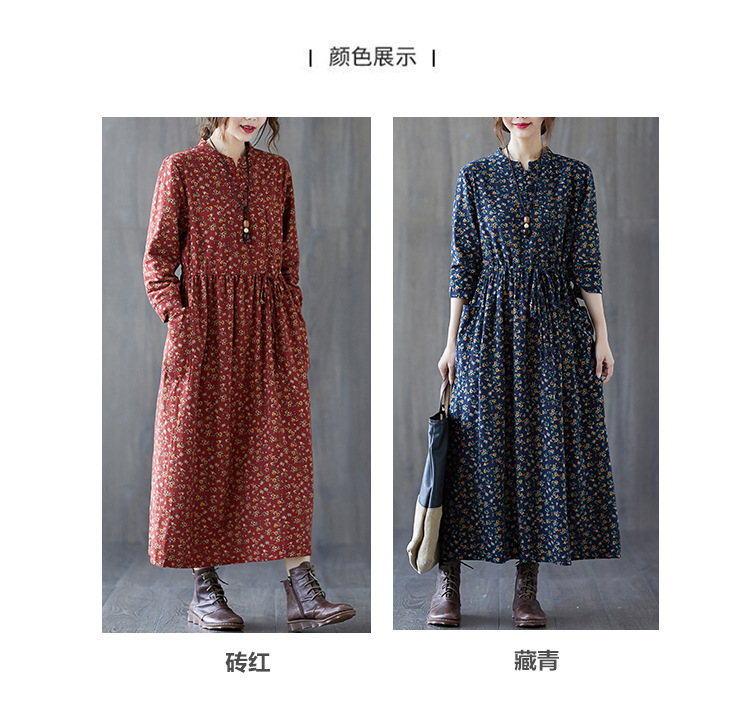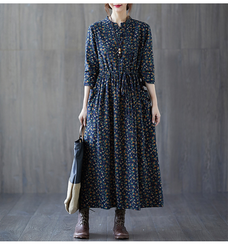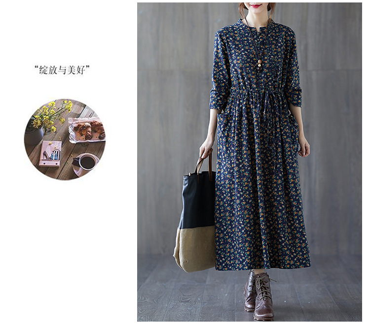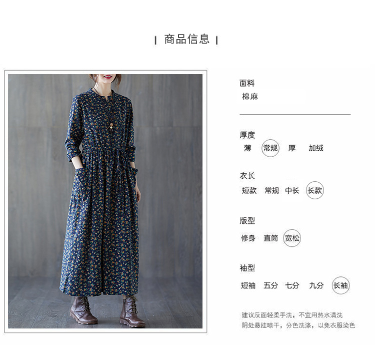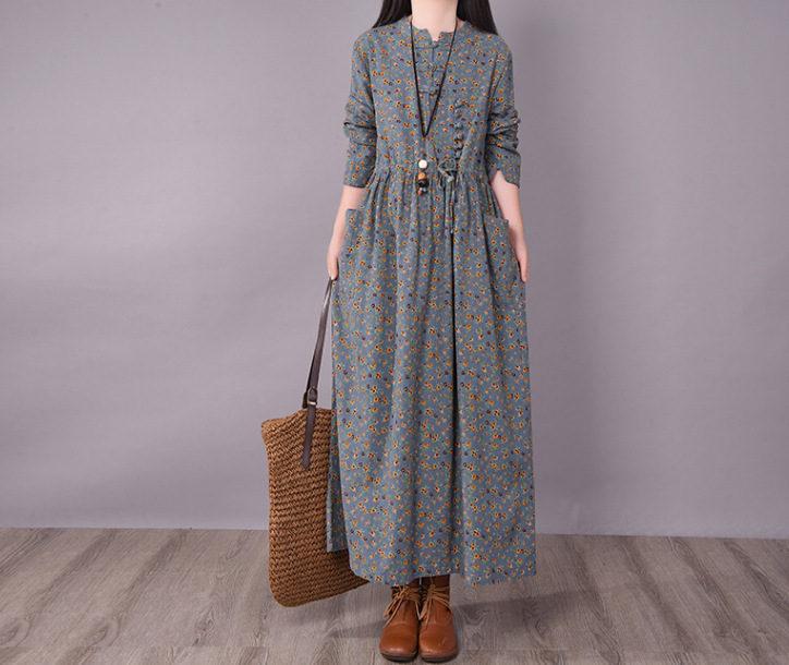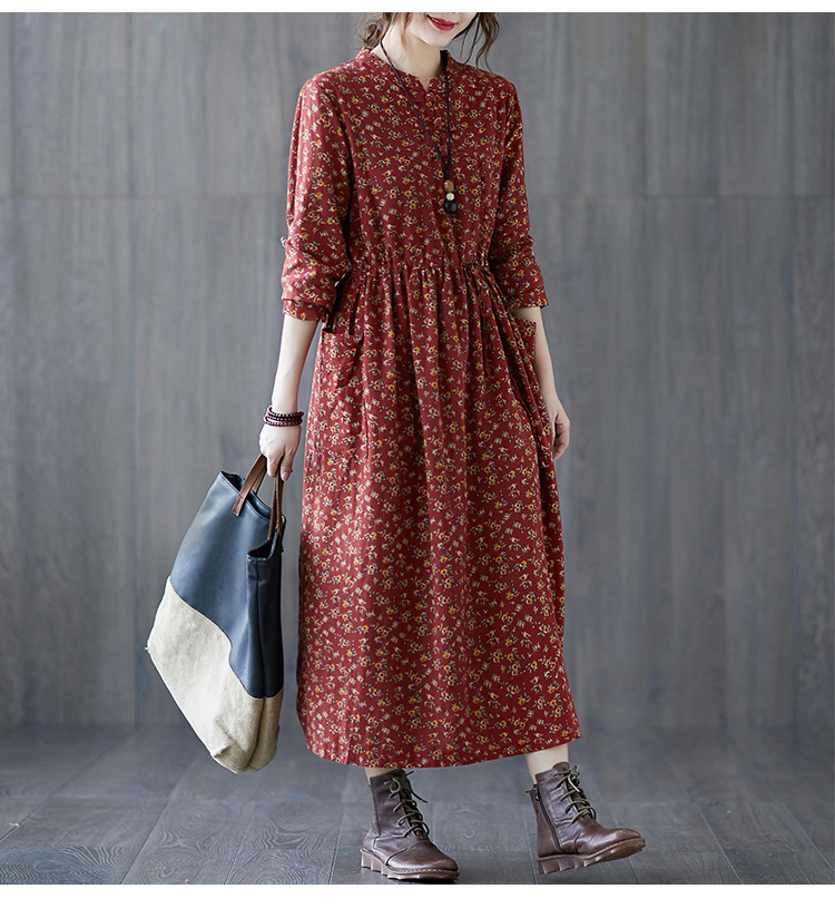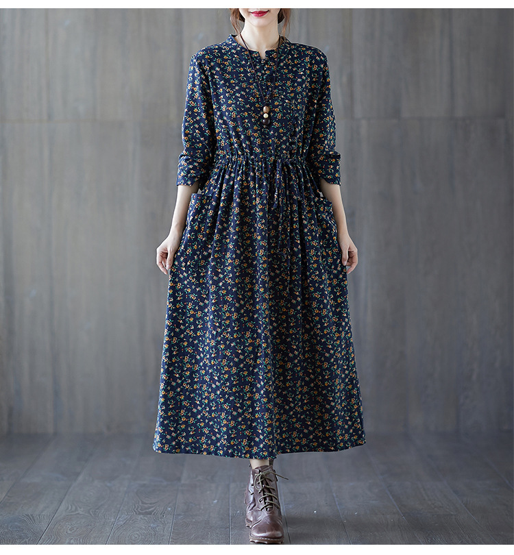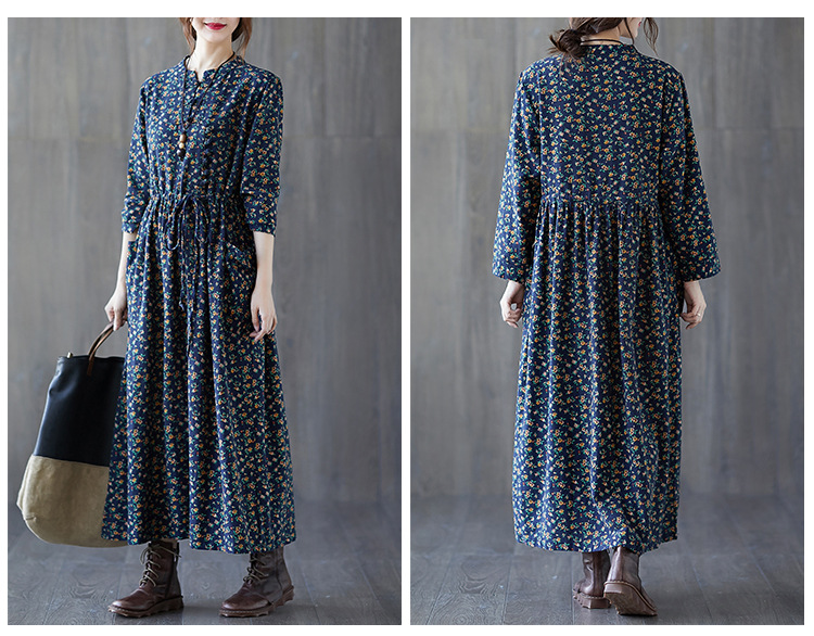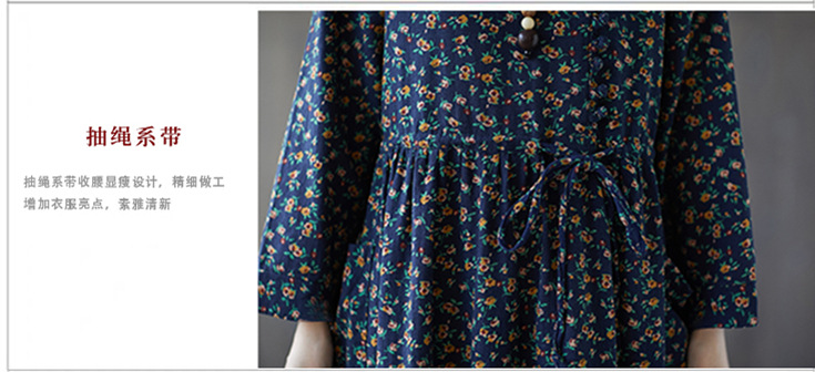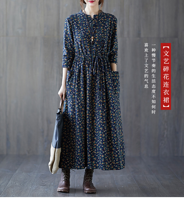 Фото реального образца: весенне-осеннее художественное свободное платье больших размеров для женщин, с пуговицами, мелким цветочным принтом, с поясом, из хлопка и льна, стройнящее фигуру.