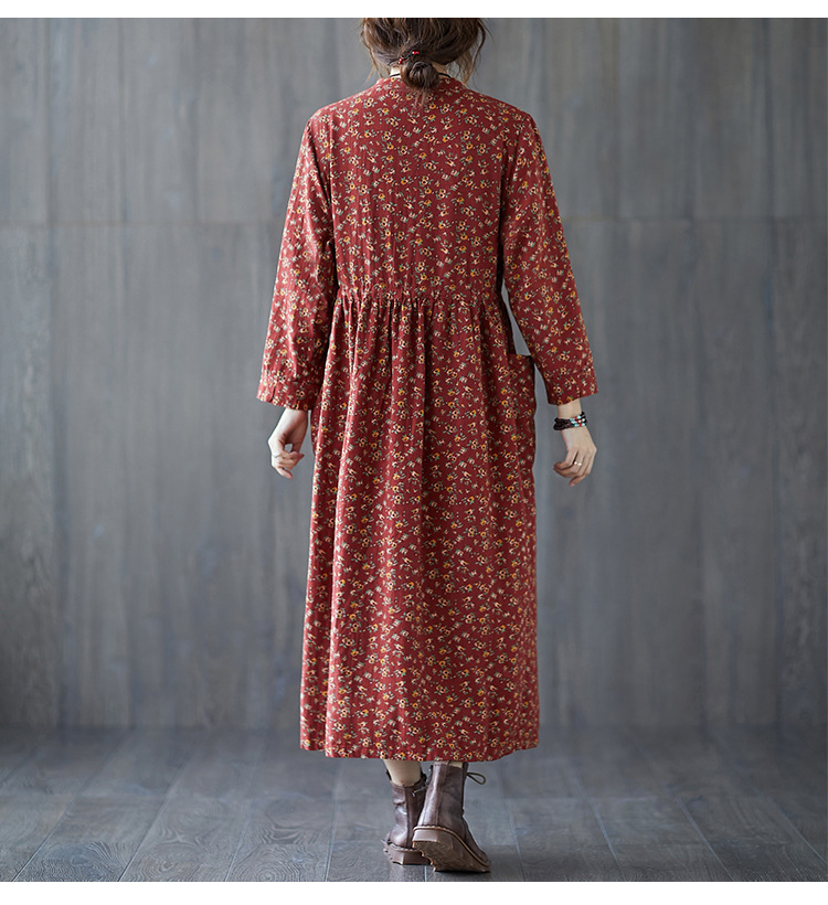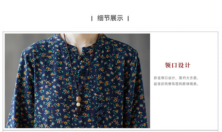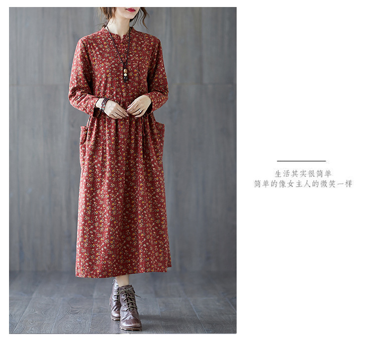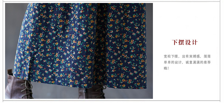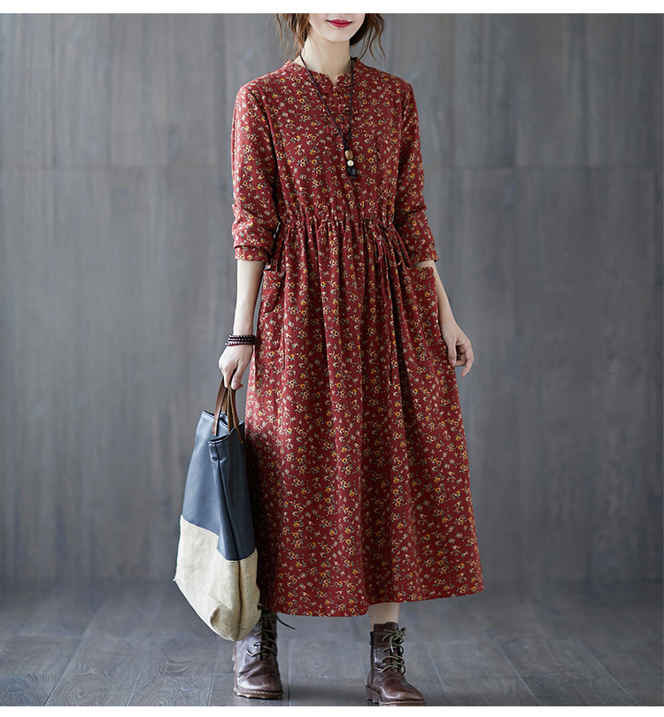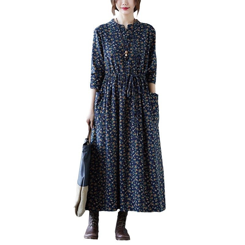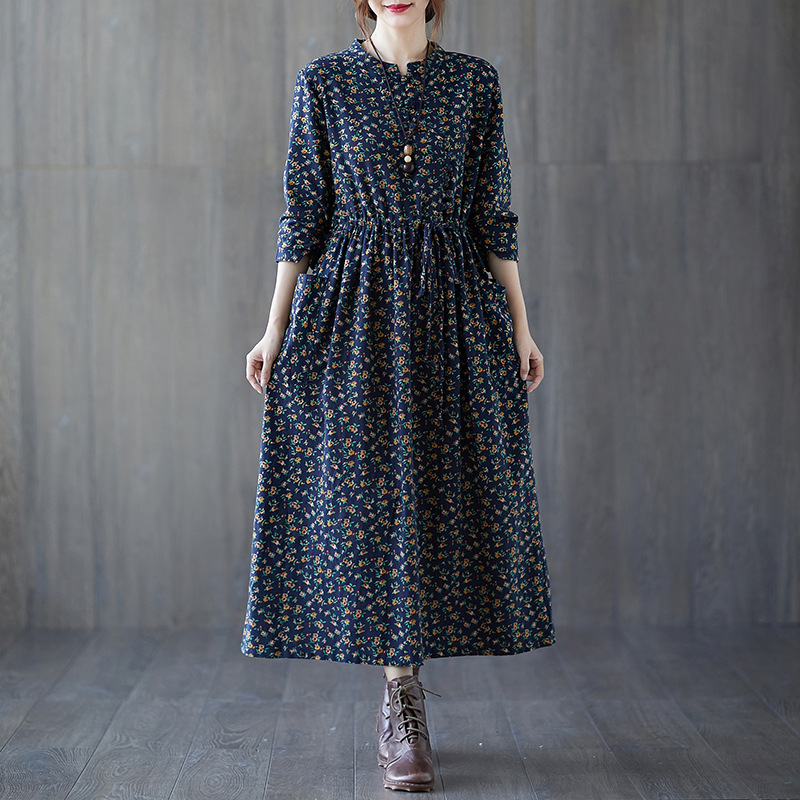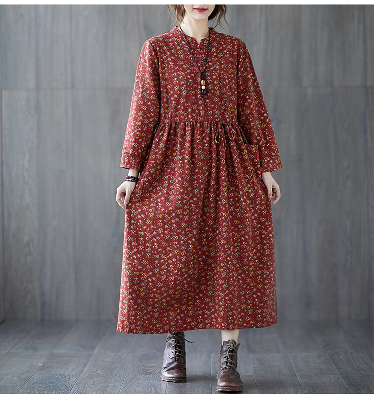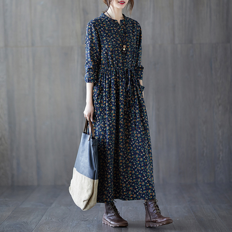 Фото реального образца: весенне-осеннее художественное свободное платье больших размеров для женщин, с пуговицами, мелким цветочным принтом, с поясом, из хлопка и льна, стройнящее фигуру.