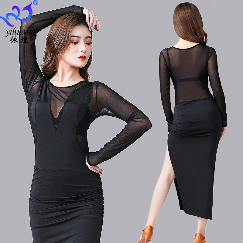 Платье латинского танца Платье с длинным рукавом Практика Платье латинского танца Сетчатое длинное платье Сплит Ледяное шелковое платье Практика