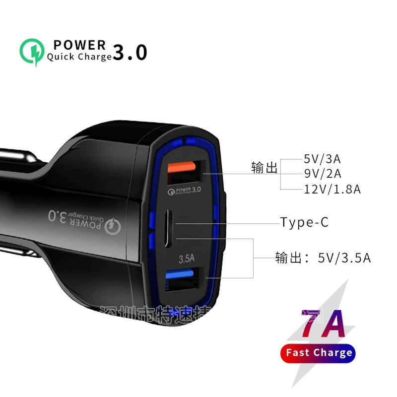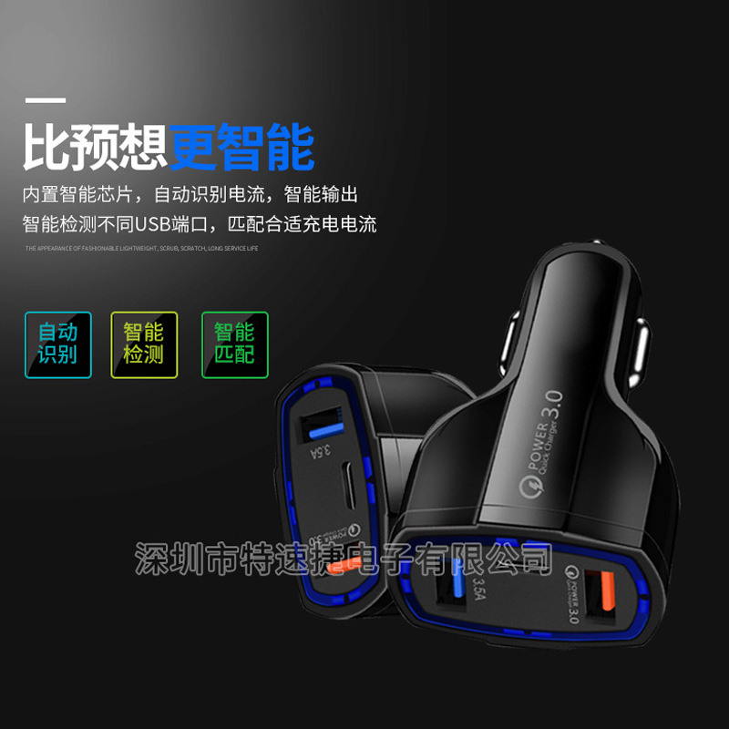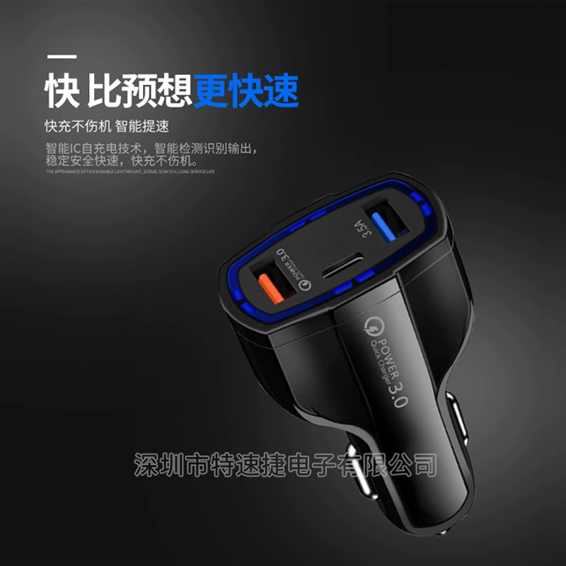 源头工厂车载一拖三type c车充速智能安全手机汽车QC3.0充电器
