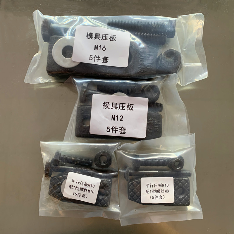 注塑机弓型压板、统一压板、元宝压板、开叉压板、马路蹄形压板、多变压板、无阶拱形压板、铣床拉杆、压规、三角规、58件装组合压板、中六角螺丝、加厚螺母、加厚垫片、六角带垫螺母、T型螺母、加硬菱形螺丝、特长螺帽、尼龙胶塞螺丝、波珠螺丝、堵头螺丝、止付螺丝、止水栓等