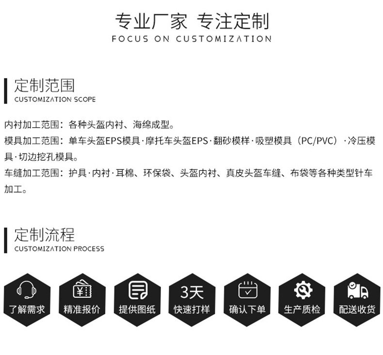 车缝加工范围:护具·内衬·耳棉、环保袋、头盔内衬、真皮头盔车缝、布袋等各种类型针车加工。
