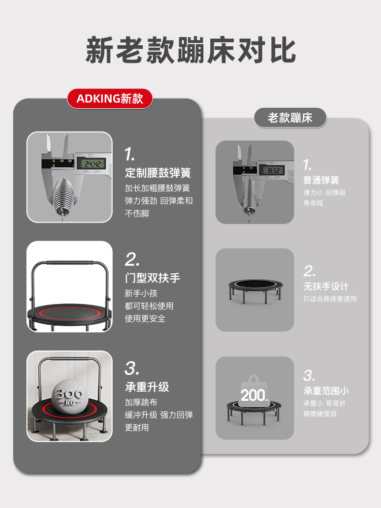 48寸+扶手弹跳直径:95cm 蹦床高度:25CM 总直径:120cm 扶手高度:70cm-90cm