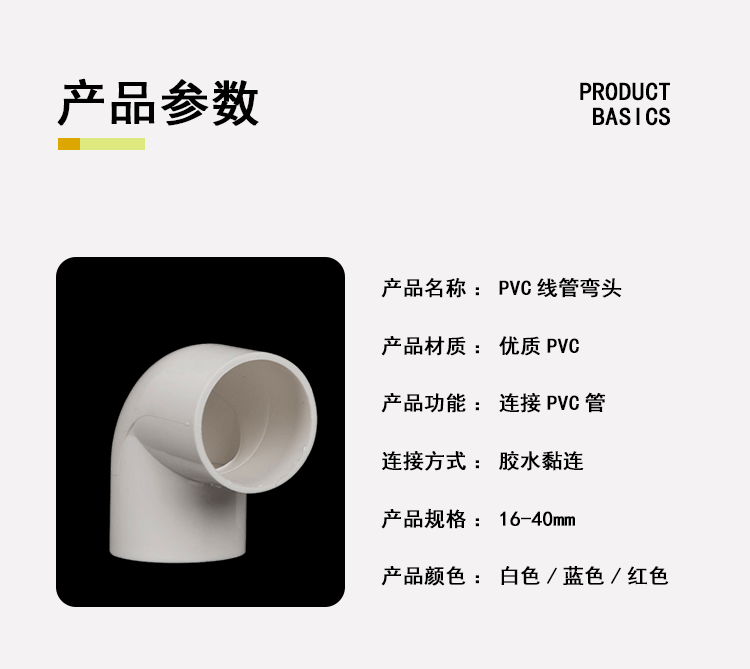 Белый - локоть национального стандарта 16 (6000 шт./шт.); Белый - 20 локтей национального стандарта (4000 шт./шт.); Белый - 25 локтей национального стандарта (2200 шт./шт.); Белый - локоть национального стандарта 32 (1300 шт./шт.); Белый - локоть национального стандарта 40 (700 шт./шт.); Белый – прямой локоть национального стандарта 45. °; Белый - 25 национальный стандарт прямой колено 45°(2500 шт./шт.); Белый - 32 национальный стандарт, прямой колено 45°(1400 шт./шт.); Белый - 40 национальный стандарт прямой колено 45°(850 шт./шт.); Белый - 16 национальных стандартных колен A (6000 шт./шт.); Белый - 20 национальных стандартных колен A (3300 шт./шт.); Белый - 25 национальных стандартных колен A (2000 шт./шт.); Красный - 16 национальных стандартных колен A (6000 шт./шт.); Красный - 20 национальных стандартных колен A (3300 шт./шт.); Красный - 25 национальных стандартных колен A (2000 шт./шт.); Синий - 16 национальных стандартных колен A (6000 шт./шт.); Синий - 20 национальных стандартных колен A (3300 шт./шт.); Синий - 25 национальных стандартных колен A (2000 шт./шт.)