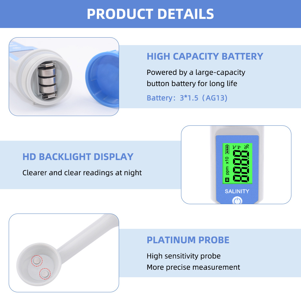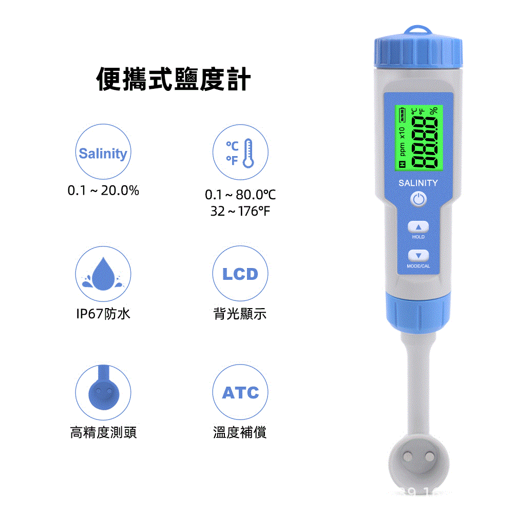 盐度范围:0.1至20.0% 盐度分辨率:0.1% 盐度精度:±1%
