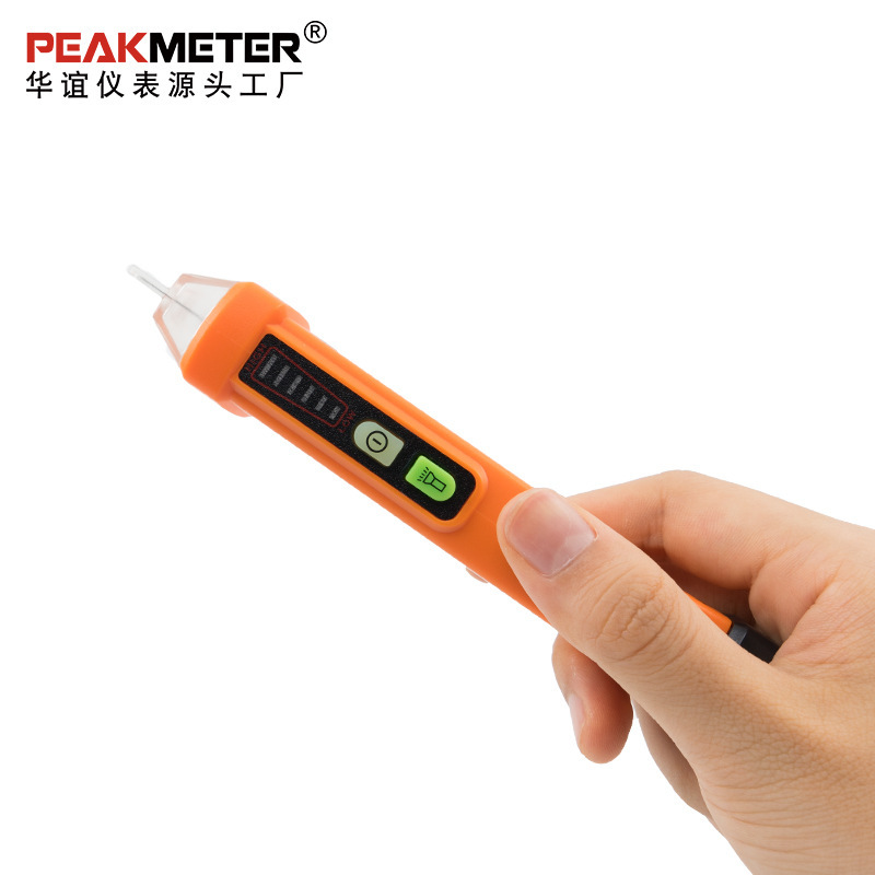 PEAKMETER/华谊PM8908C智能非接触交流电压探测笔,通过感应交流电压产生的电磁场从而更加安全,可靠快捷的判别被测物体是否带有交流电压,仪表通过自动调节仪表本身的灵敏度从而感应到不同强度的电磁场(不同强度的电磁场,具有不同颜色LED及不同频率的声音指示)从而使仪表既能准确的区分火线,零线,又可以作为简单的寻线器,寻找交流线路火线的走向,仪表符合最新欧盟安规标准,EN61010-1-2-030 1000V CAT III安全标准,并符合ROHS/REACH等环保认证,测量范围,12V-1000V(交流电压50-60HZ)