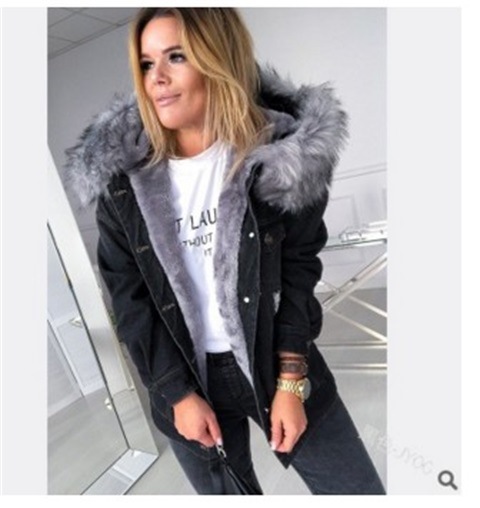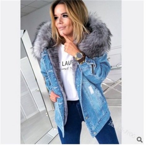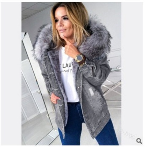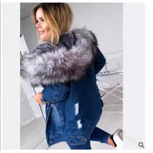 Q020 Европейское и американское джинсовое пальто в стиле ретро с большим меховым воротником, темперамент на флисовой подкладке, теплое Рваное пальто средней длины, модное потертое пальто