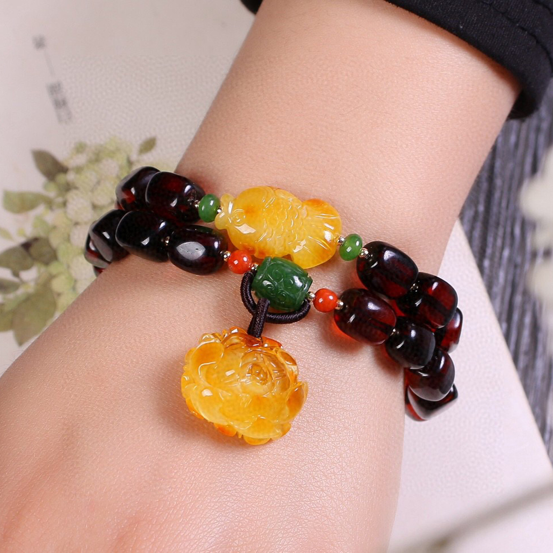 Натуральная вода Очищенная кровь Фиолетовый Янтарный двухкруговой браслет с подвеской в виде цветка пиона из пчелиного воска Многокруговой браслет