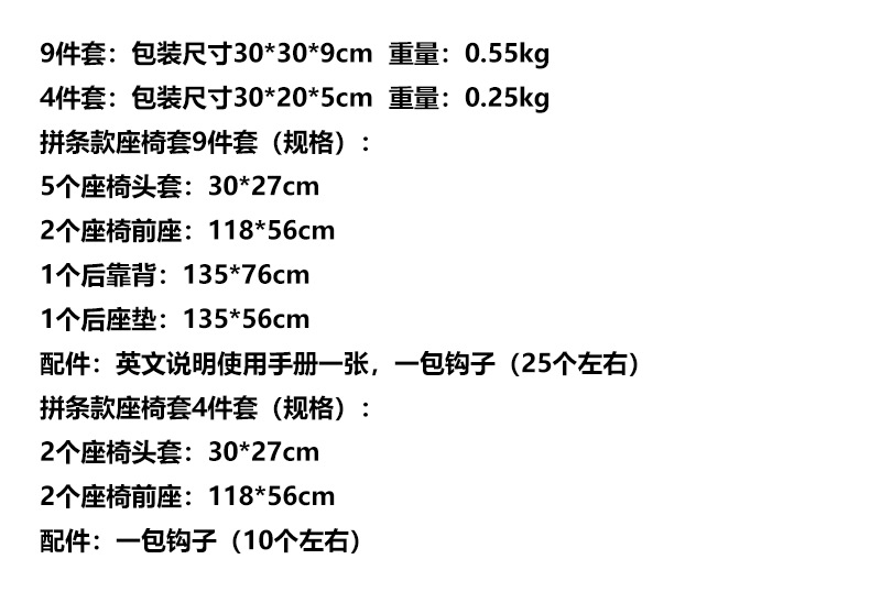 Комплект из 2 предметов (переднее одинарное сиденье); Комплект из 4 предметов (два сиденья в первом ряду); Комплект из 9 предметов (полный комплект из пяти мест)