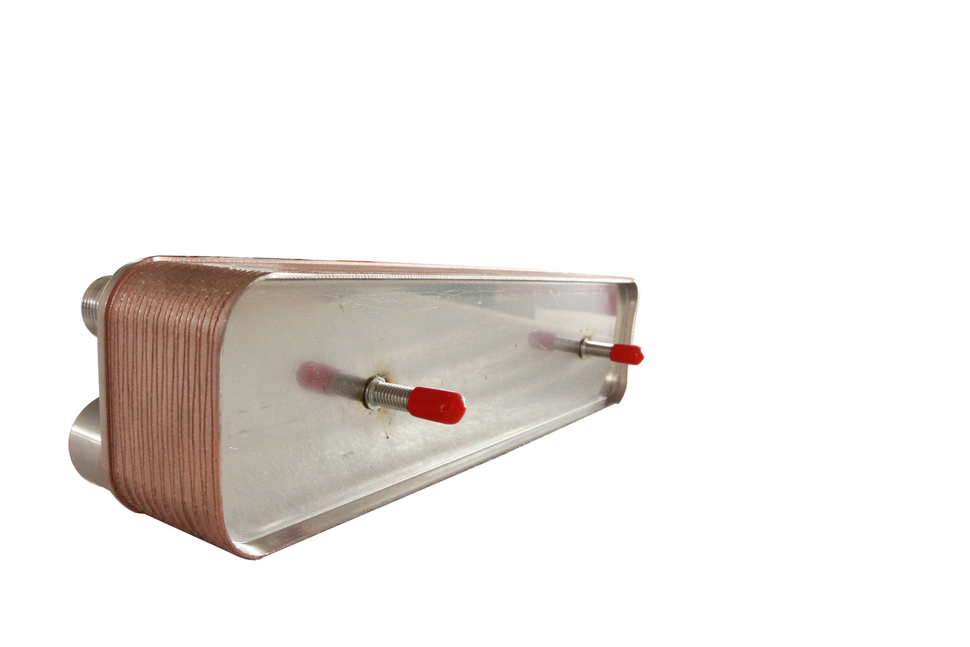 钎焊板式换热器是密封垫板式换热器的升级。它是由shou、尾挡板及人字形波纹状板片组合而成,相邻板片的波纹板角朝向相反,板组