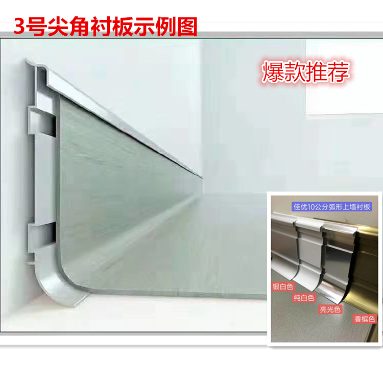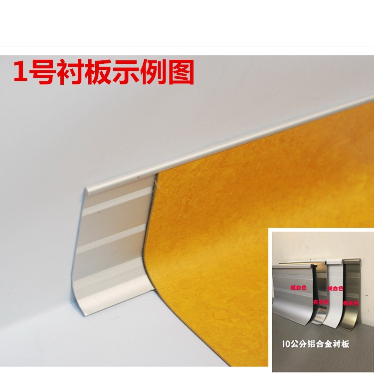 产品用途:铝合金上墙衬板,施工简易,一次性解决地板上墙内阴角弧度 ,地板收口,地板上墙收边经久耐用。美观大方
