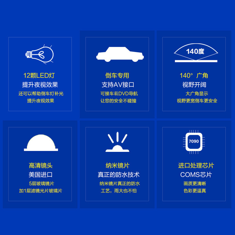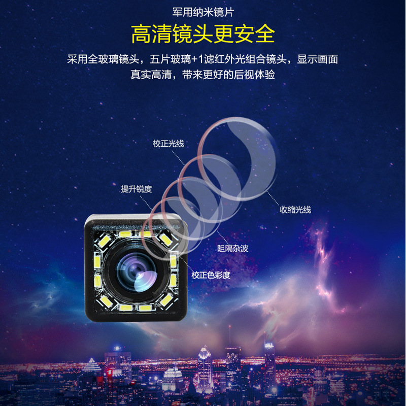 此产品为12灯外挂倒车摄像头 采用7090高清芯片 玻璃镜头,成像清晰,大广角