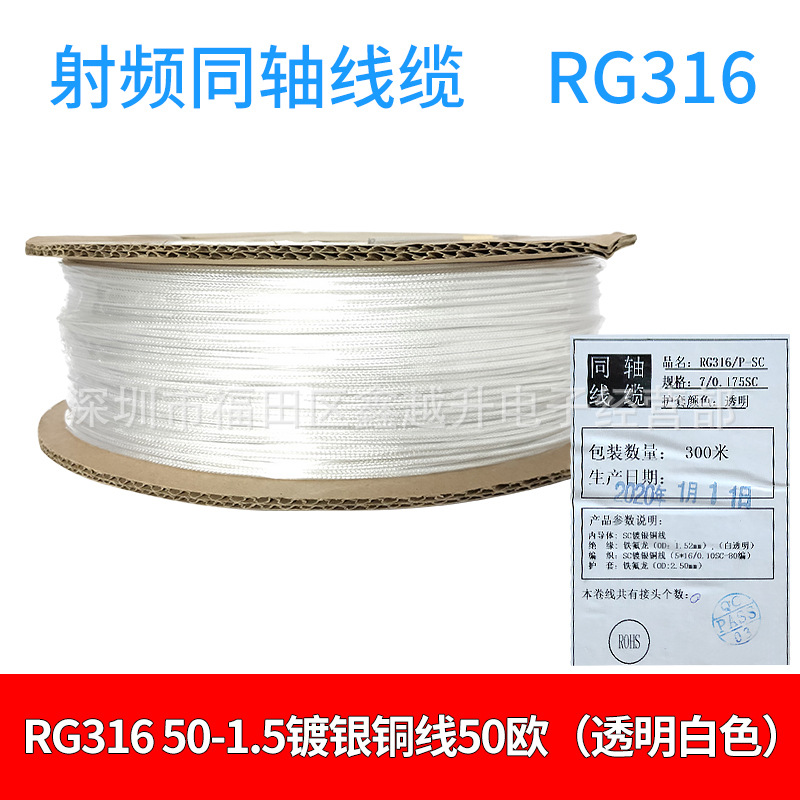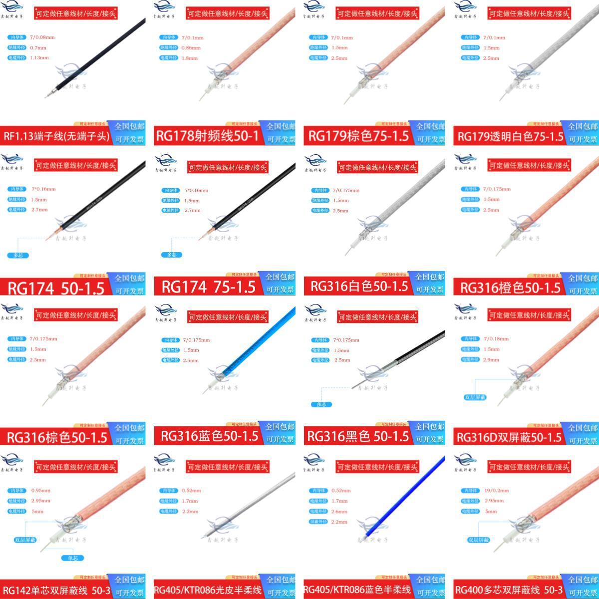 РФ1.13; RG174; RG178 50-1 многоядерный; RG179 Белый 75 Евро; RG179 Коричневый 75 евро; RG316 белый; RG31 Коричневый; Черный RG316; RG316 оранжевый; RG316 синий; RG316D коричневый двойной экран; RG58 одноядерный 96; RG58 многоядерный 128; RG59(SYV75-4) одноядерный; RG142-PUR синяя нить из мягкой кожи; Оранжевый одноядерный двойной экран RG142; Мульти-ядра RG400; RG142 оранжевый одноядерный один щит; Двойной серебряный провод RG223; SYV50-3; SYV50-5 многоядерный; SYV50-5 одноъядерный; SYV50-7; SYV75-3; SYV75-5; 5Д-ФБ 50-5; 7Д-ФБ 50-7; LMR195; LMR200; LMR240; Lmr400; RG401/KTR250-5 синяя полугибкая леска; RG402/KTR141 синяя полу-гибкая леска; RG405/KTR086 синий полугибкий провод; Полугибкая линия с легкой кожей RG402; Полугибкая линия с легкой кожей RG405; SFT50-1 половина стальной проволоки 047 внешний диаметр 1,2 мм; SFT50-2 половина стальной проволоки 086 внешний диаметр 2,2 мм; SFT50-3 полу-стальная проволока 141 внешний диаметр 3,65 мм; SFT50-5 Полустальная проволока 250, внешний диаметр 6,35 мм