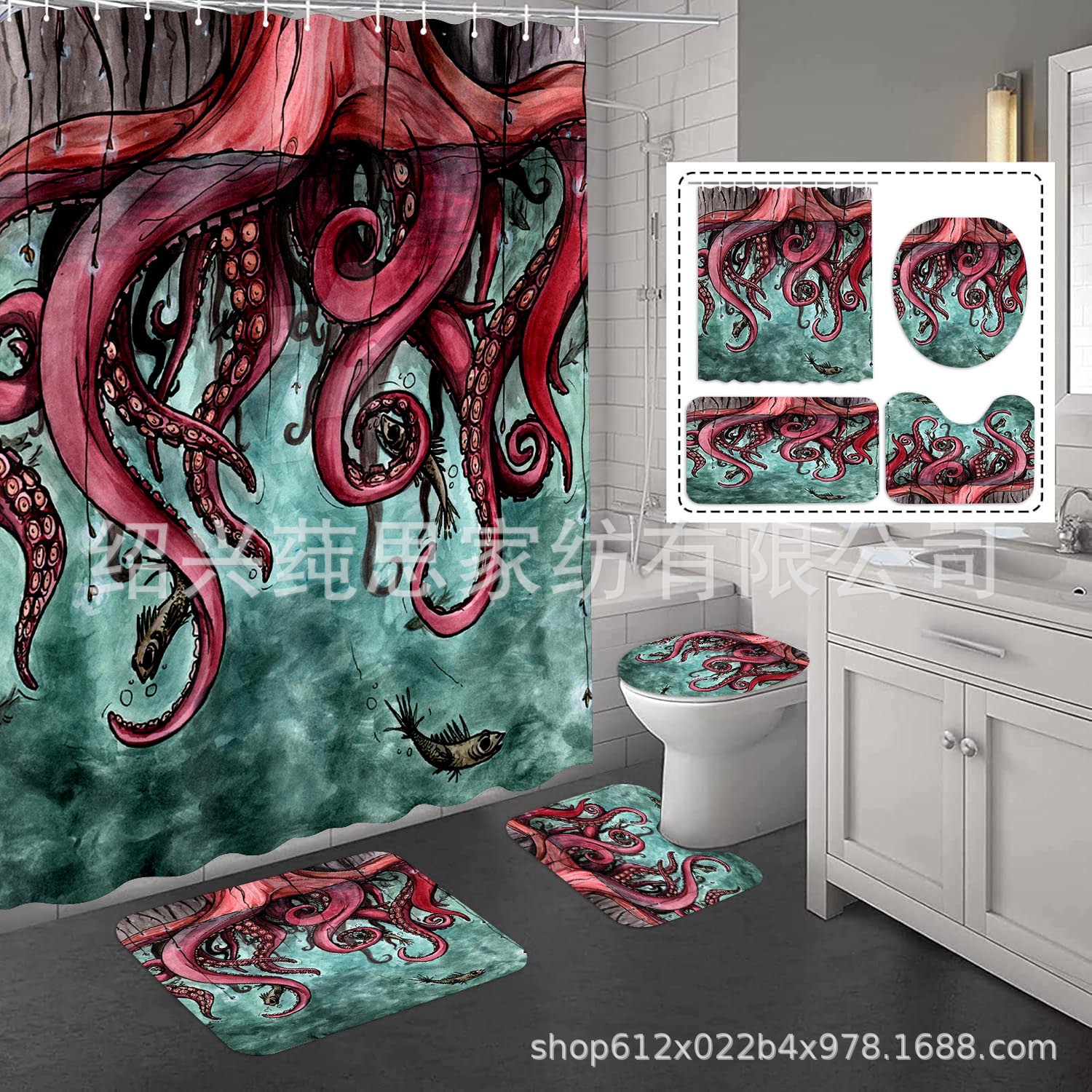 Прямые продажи с фабрики, трансграничная популярная серия "Осьминог", водонепроницаемая и устойчивая к плесени полиэстеровая душевая занавеска с цифровой печатью, комплект из четырех предметов для ванной комнаты.