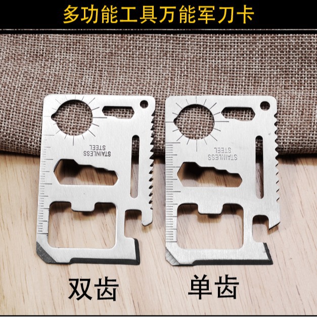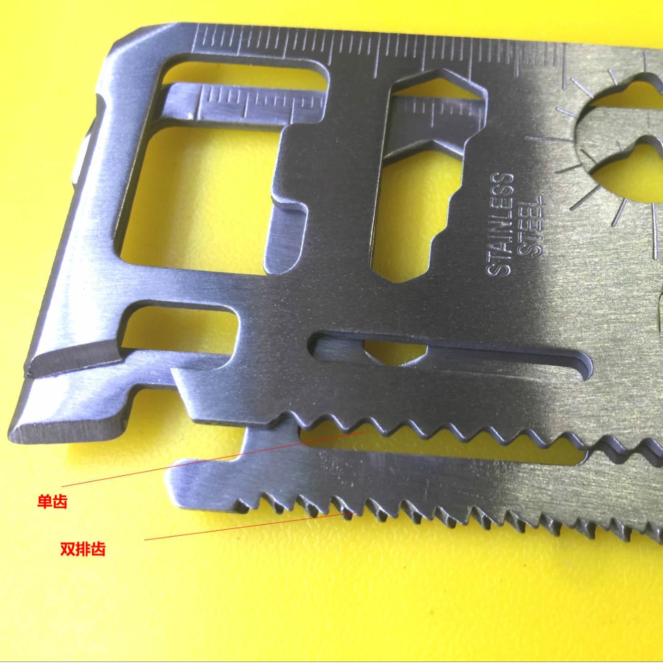 产品概述:420优质不锈钢整体,做工精致,正反面均光亮平整,出口产品,配图纸说明,刀刃锋利,钢体坚固,锯齿更是在薄薄的卡片上采用双排交错齿。整块高硬度不锈钢一次成型,强度高,刃口锋利。规格同信用卡大小相仿,外带黑色皮革保护套,能够避免刃口伤及自身,并可放入钱夹随身携带。如此小巧实用的救生卡,在钱夹装一个或者在钥匙环上挂一个,不管是居家过日子还是旅游,钓鱼野营,都如同随时携带了一个简易的工具箱,你不想尝试一下吗?