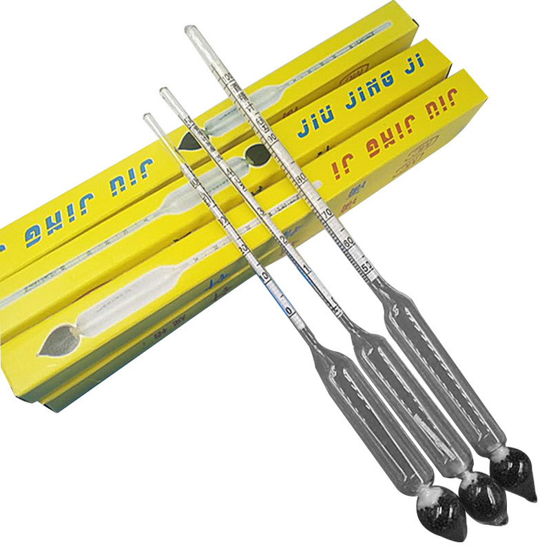 测量浓度时,将部分酒精倒入量筒中,注意不要倒得过满,再把温度表和酒精表放入量筒里不要贴筒壁,稍等片刻,目光平视看准温度与酒度,通过《酒度、温度换算表》,然后查出标准(20℃的酒度)。使用酒精计测量酒度时,应注意:由于表面张力的原因,酒精表面与酒精计长轴的接触处会出现弯月面。因此,我们在读数时,应以水平面为准