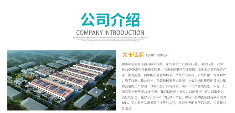 佛山市弘熙变压器有限公司是一家专业生产低频变压器、逆变压器、220V转110V电源电压转换变压器、电源变压器环型变压器、EI型变压器的生产厂家、拥有完整、科学的质量管理体系。产品广泛应用于公共广播、专业功放、教学仪器、舞台灯光、包装机械等各大领域。本公司拥有雄厚的技术力量和完善的生产检测、试验设备。具有开发、设计、生产各类新型、 、 、低噪音变压器的能力.多年来,我们以技术为先驱,以质量求生存,以服务为责任的宗旨,赢得了广大用户的信赖和赞誉,佛山市弘熙变压器有限公司的诚信、实力和产品质量获得业界的认可。欢迎各界朋友莅临参观、指导和业务洽谈。
