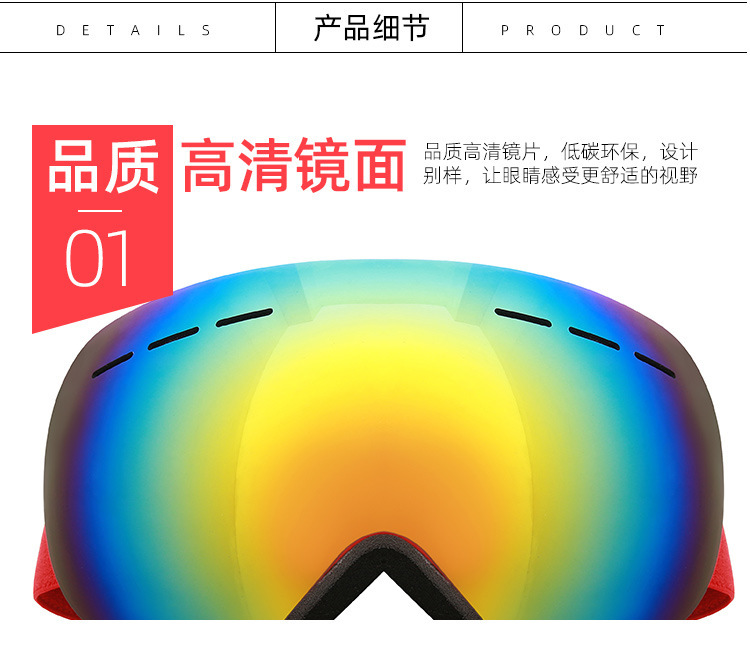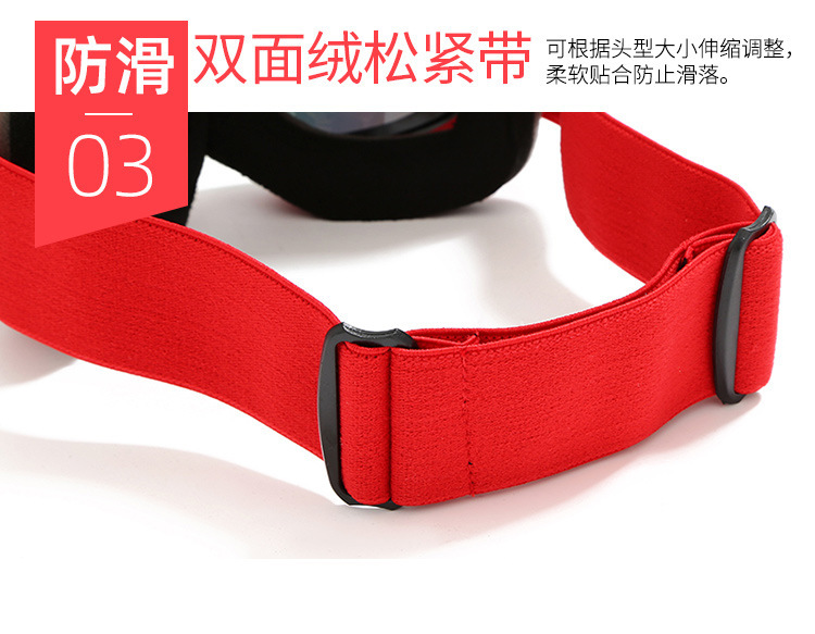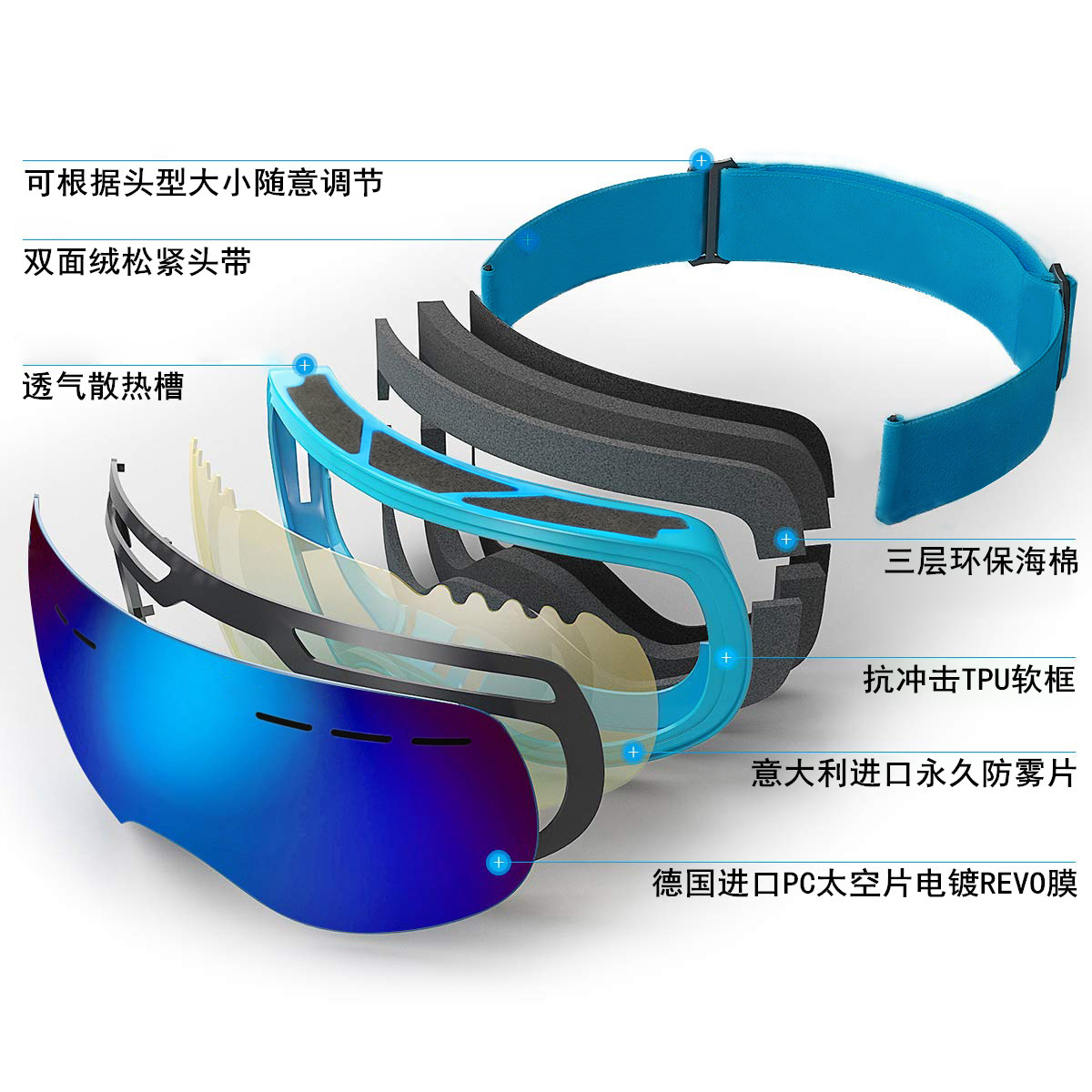 TPU镜框,REVO镀膜德国PC片,意大利进口双层防雾片,三层海绵,双面绒松紧带