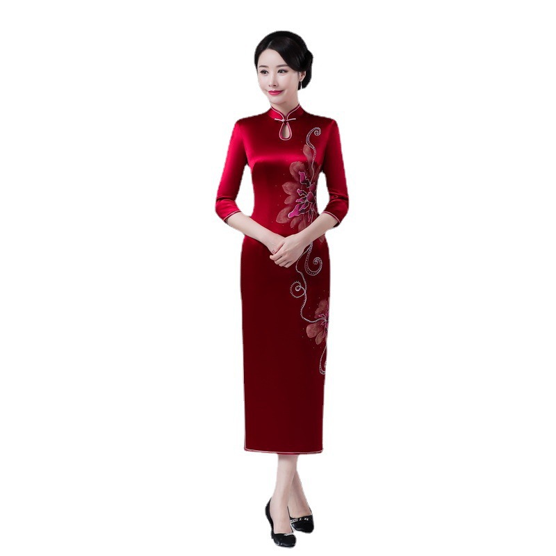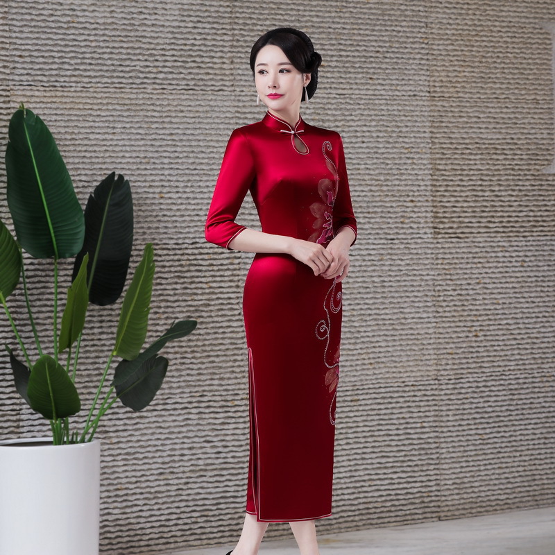 2022 весна новый свадебный тост длинное тяжелое ацетатное платье Чонсам в стиле ретро Улучшенная Мода с рукавом 3/4