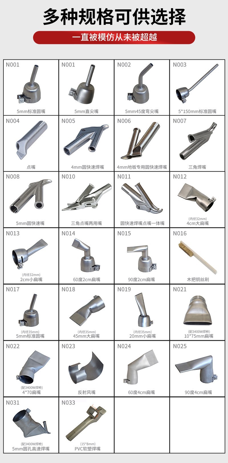 N001-5 мм стандартный круглый рот (внутренний диаметр 32 мм); N002-5 мм изогнутый наконечник под углом 45 градусов; N003-5*150 мм стандартный круглый рот; N004-Рот с фиксированной точкой; N005-4 мм сварочный наконечник с круглым отверстием; Специальная круглая насадка для быстрой сварки N006-4 мм для пола; Треугольное сварочное наконечник типа N007-Y (по умолчанию 6*7 мм, обратите внимание на модель при размещении заказа); N008-5 мм круглый наконечник для быстрой сварки; N010- Треугольное сварочное жало для 0.3*0.35kg; N011-5MM Сварочный наконечник двойного назначения с круглым отверстием; N012-40мм плоский рот; N013-20мм маленький плоский рот; N014-60 градусов, плоский рот 20 мм; N015--90 градусов, плоский рот 2 см; Стандартный круглый рот N017-5 мм (внутренний диаметр 35 мм, сварочный пистолет 2000 Вт); N018-45 мм большой плоский рот (внутренний диаметр 35 мм, сварочный пистолет 2000 Вт); N019-20 мм маленький плоский рот (внутренний диаметр 35 мм, сварочный пистолет 2000 Вт); N021-10*75 мм плоское сопло (с сварочным пистолетом мощностью 3400 Вт); N023-3400W-отражающее воздушное сопло (с сварочным пистолетом мощностью 3400 Вт); N033-15*8MMPVC сварочный наконечник из мягкого пластика; N024-60 градусов 4 см плоский рот; N025-90 градусов 40nn плоский рот; N022-4*70MM плоский рот; Высокоскоростное сварочное жало с круглым отверстием N031-5MM (для сварочного пистолета мощностью 3400 Вт)