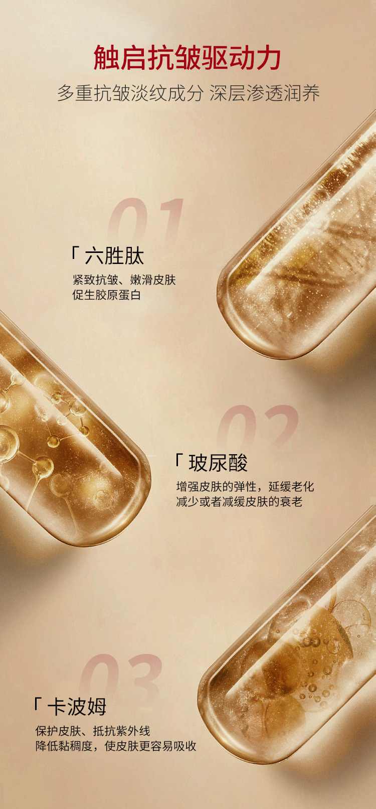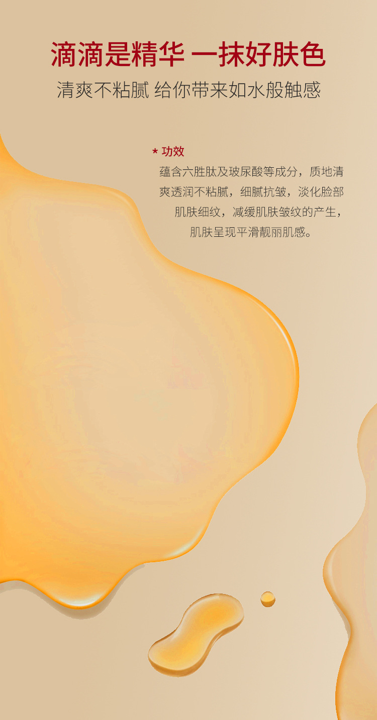 【功效】蕴含六胜脑及玻尿酸等成分,质地清爽透润不粘腻;细腻抗皱,淡化脸部肌肤细纹,减缓肌肤皱纹的产生,肌肤呈现平滑靓丽肌感。