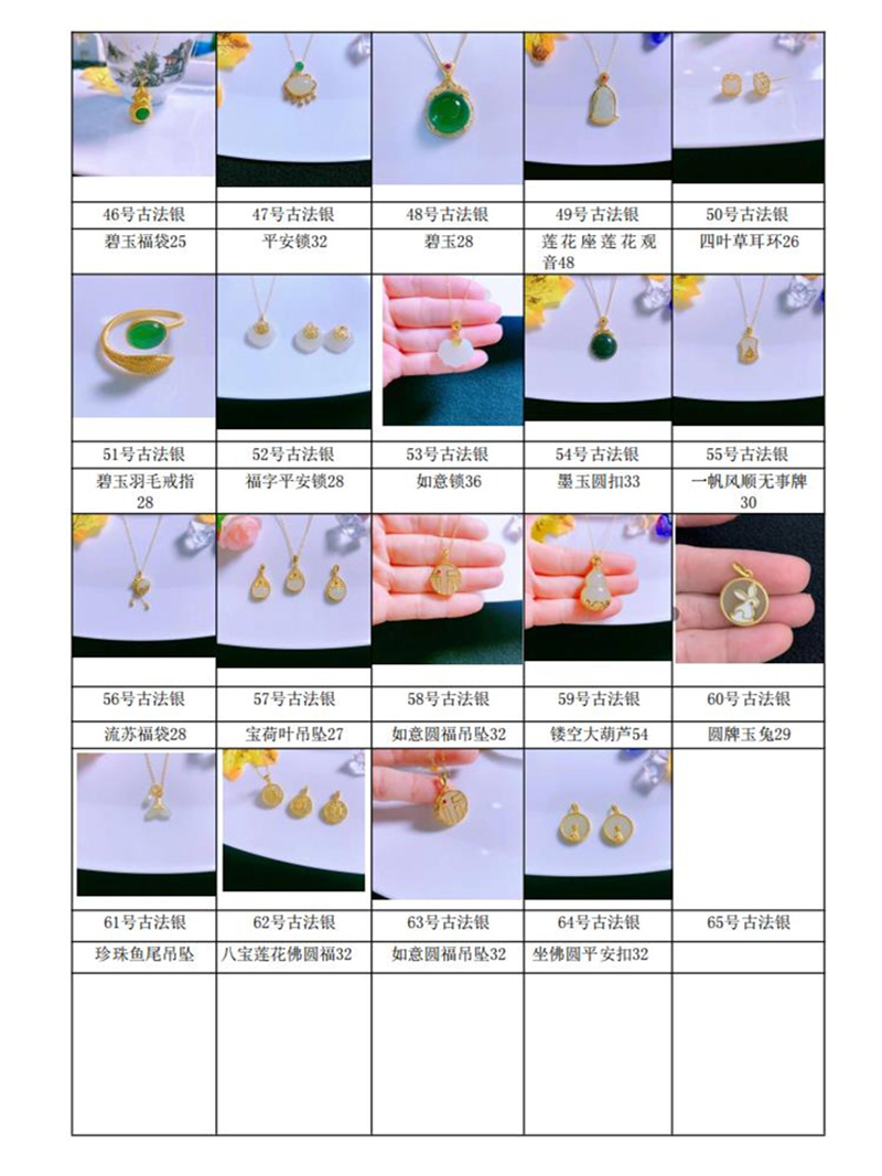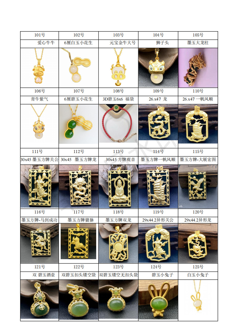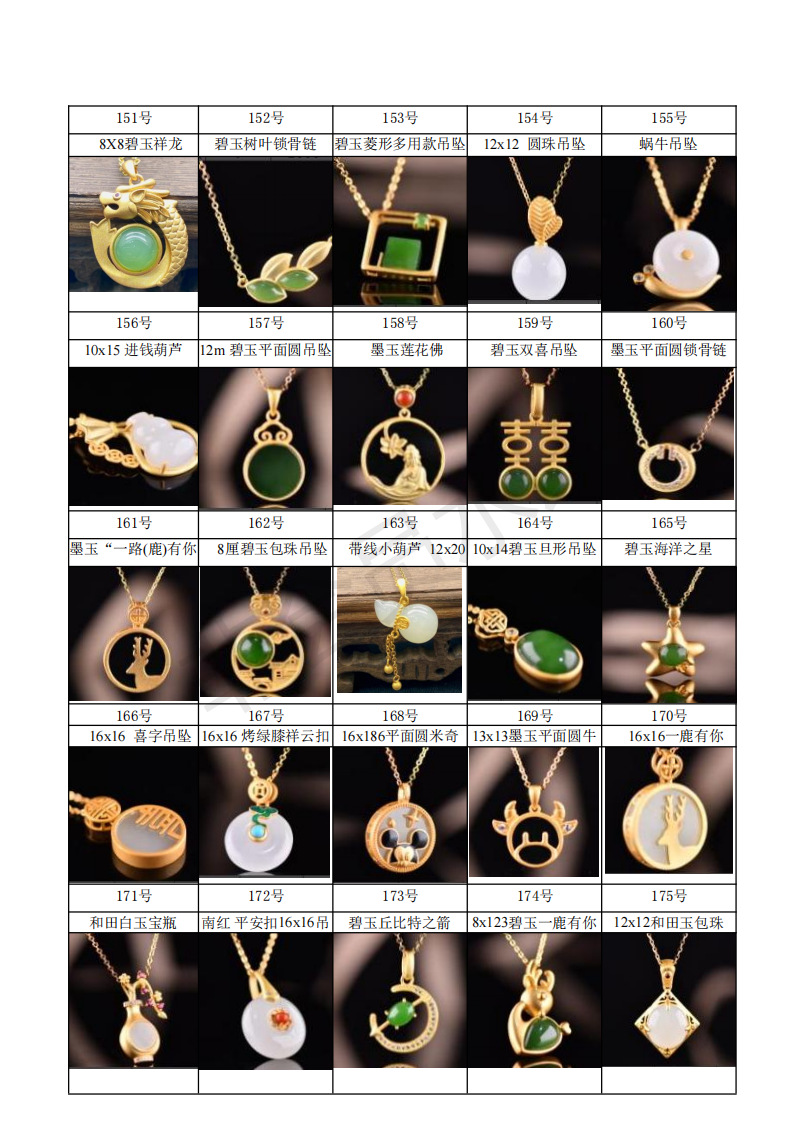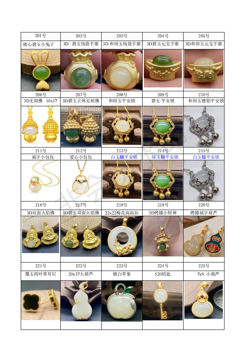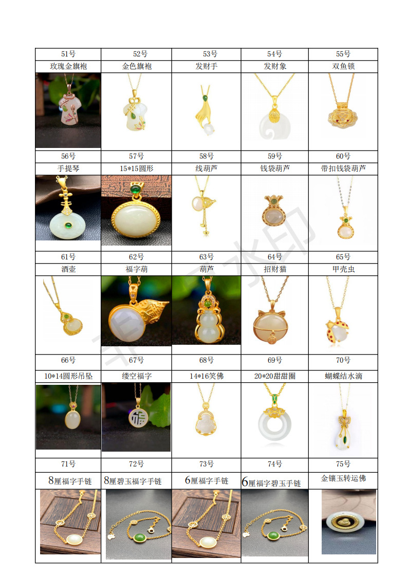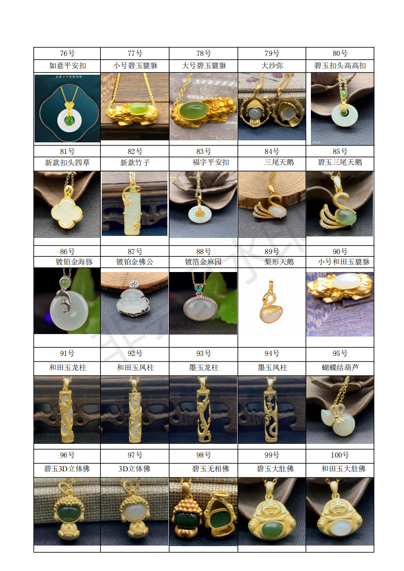Золотая сумка; Будда без фазы; Трехмерный маленький монах-Новичок; Переплетение; Перенос бисера; Юбка с пряжкой из яшмы; Пончики 2; Дельфин Пинг Пряжка; Пряжка из яшмы серебряный замок; Маленькая Вишня; Четыре листа клевера с пряжкой из яшмы; Жуйи; Яшма четыре листа клевера; Высокая; Халцедон оливковые бусы; Юньнань цветок; Золотой чонсам; Богатая рука.; Слон Фортуны; Золотой Пиксиу; Жук; Полый персонаж фу; Смеющийся Будда; Пончики; Великий мудрец; Яшма Пряжка голова Высокая пряжка; Новый бамбук; Фанпай Гуаньинь; Мою площади Марка Дракон; Мо Ю Клык карты Гуань Гун; Бренд Дракон Мою; Чужеродные Гуань Гонг; Бренд Xiaofang Гуаньинь; «Свет Будды; Фу Ху Клык Бренд; Квадратная карточка Тигра; Браслет-четыре листа клевера; зеленый арахис; Сяньюнь Пин Ан Пряжка; Нитка счастливая сумка; Мини-сумка Lucky Charm